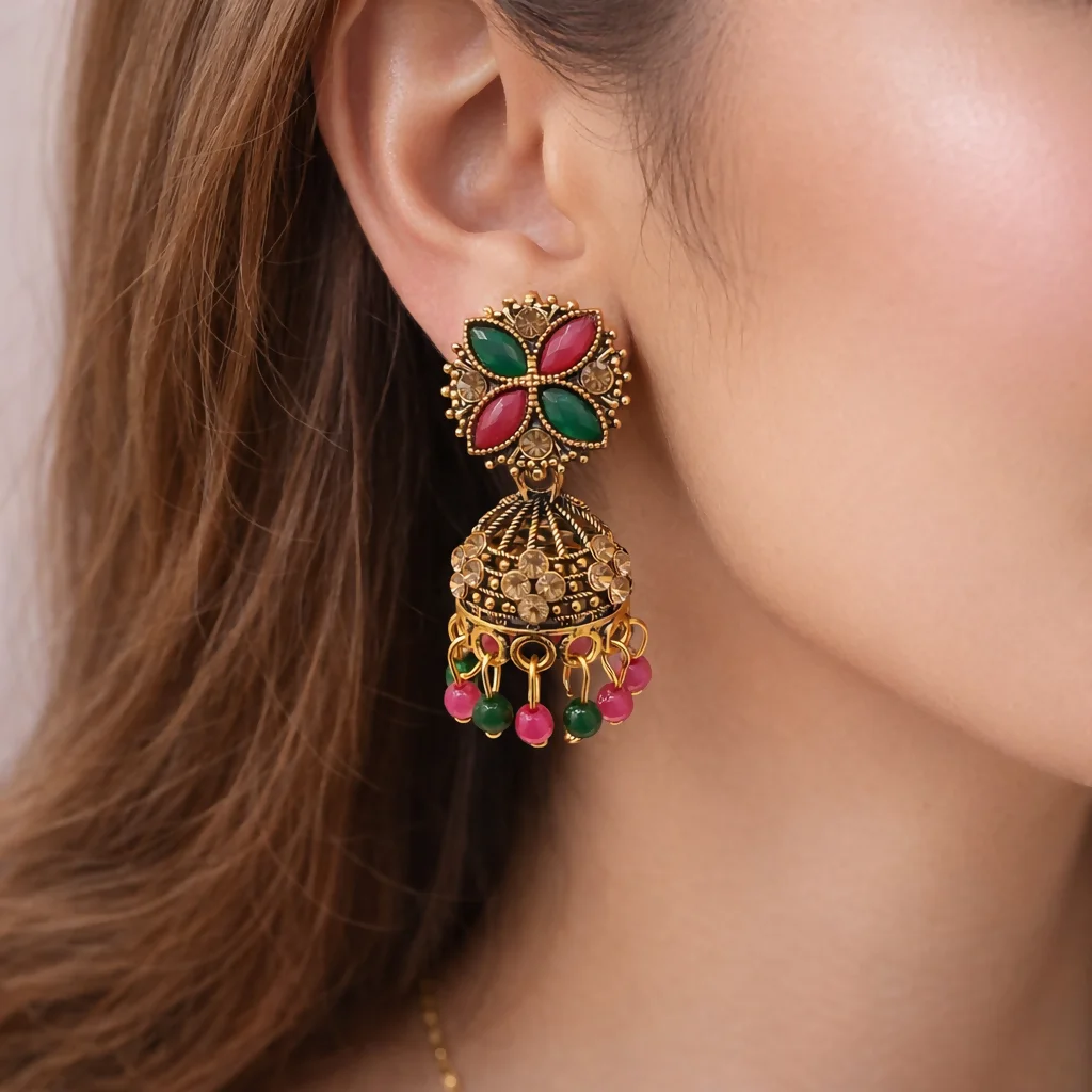 These vibrant gold-tone jhumka earrings feature a stunning floral stud design adorned with rich pink and green stone petals, highlighted with sparkling crystal accents. The intricately detailed dome is embellished with shimmering stones and fine textured craftsmanship, giving it a luxurious traditional appeal. Delicate pink and green bead danglers at the bottom add playful movement and enhance the festive charm. Perfect for weddings, Navratri, festive celebrations, and ethnic outfits, these earrings beautifully blend bold colors with timeless elegance, making them a standout addition to any jewellery collection. ✨