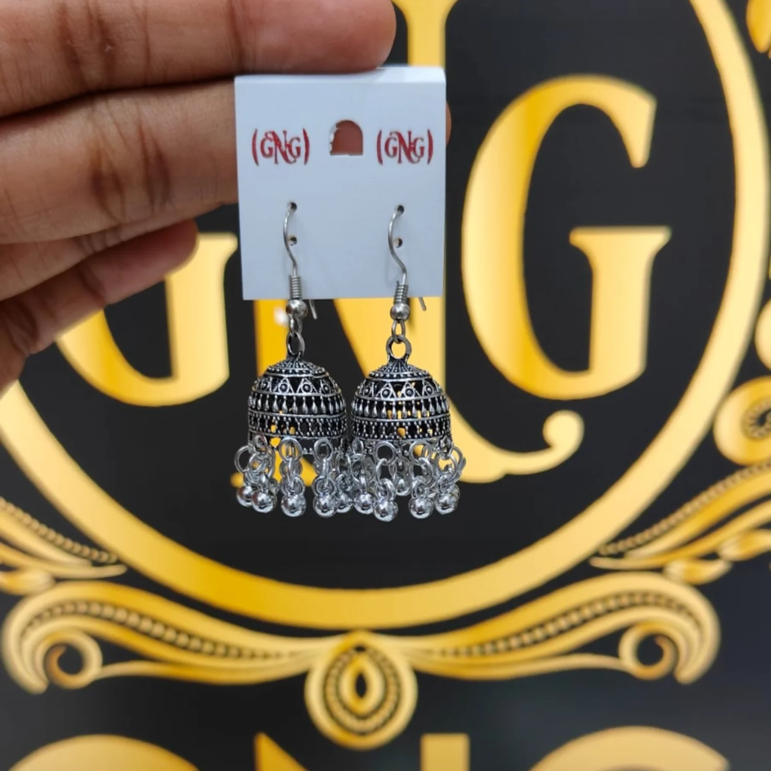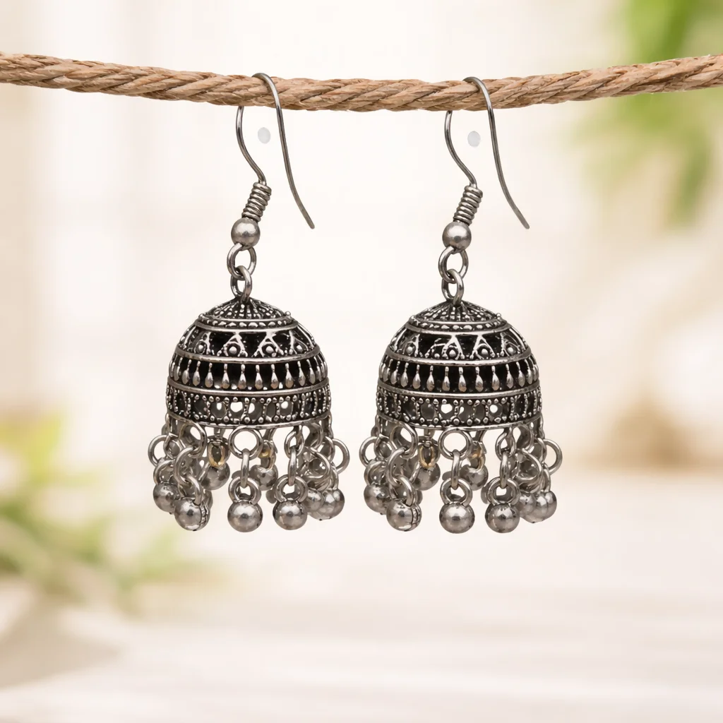 These elegant oxidized silver-tone jhumka earrings feature a beautifully detailed dome design with intricate engraved patterns and delicate cutwork. The base is adorned with multiple tiny metallic beads that create a graceful dangling effect, adding movement and charm with every step. Lightweight yet eye-catching, these traditional earrings are perfect for festive occasions, ethnic wear, and everyday styling with a classic touch.