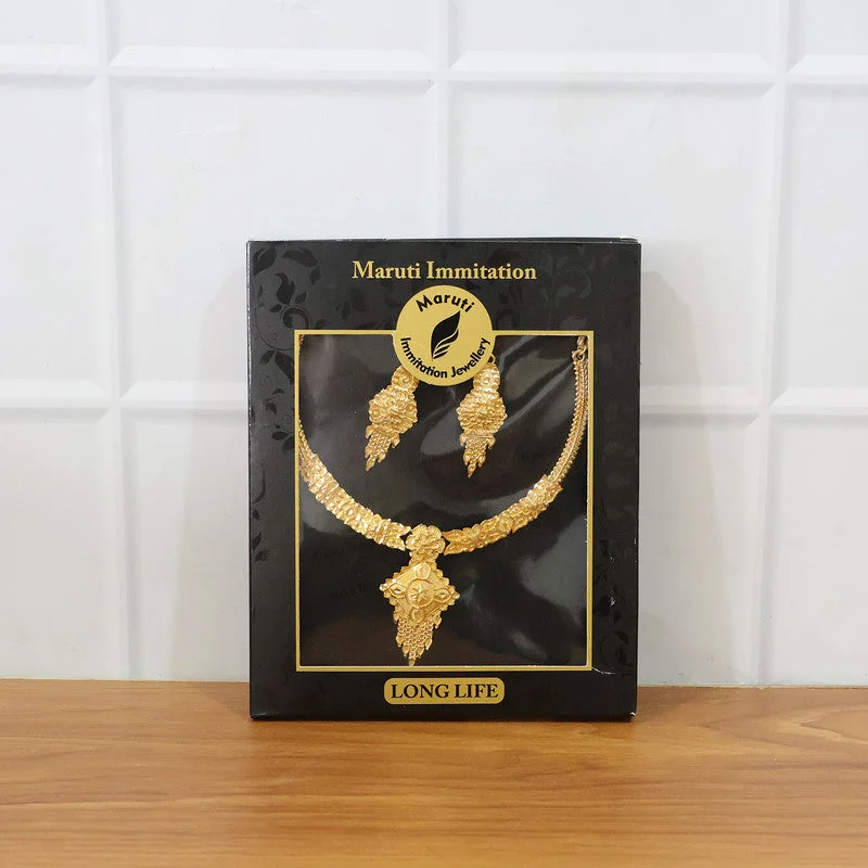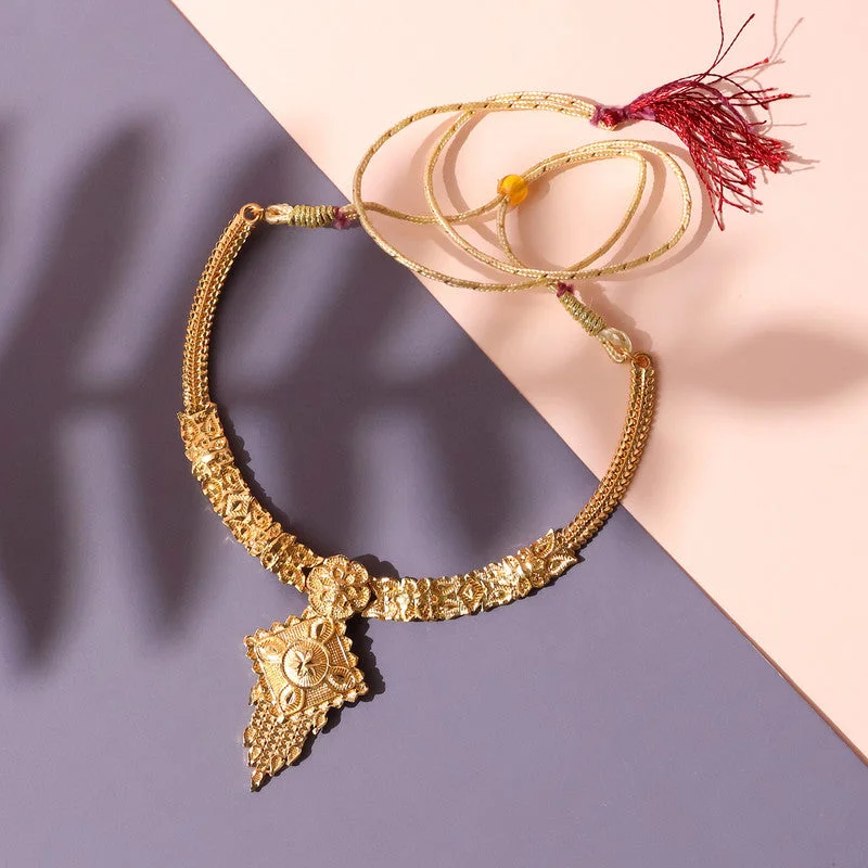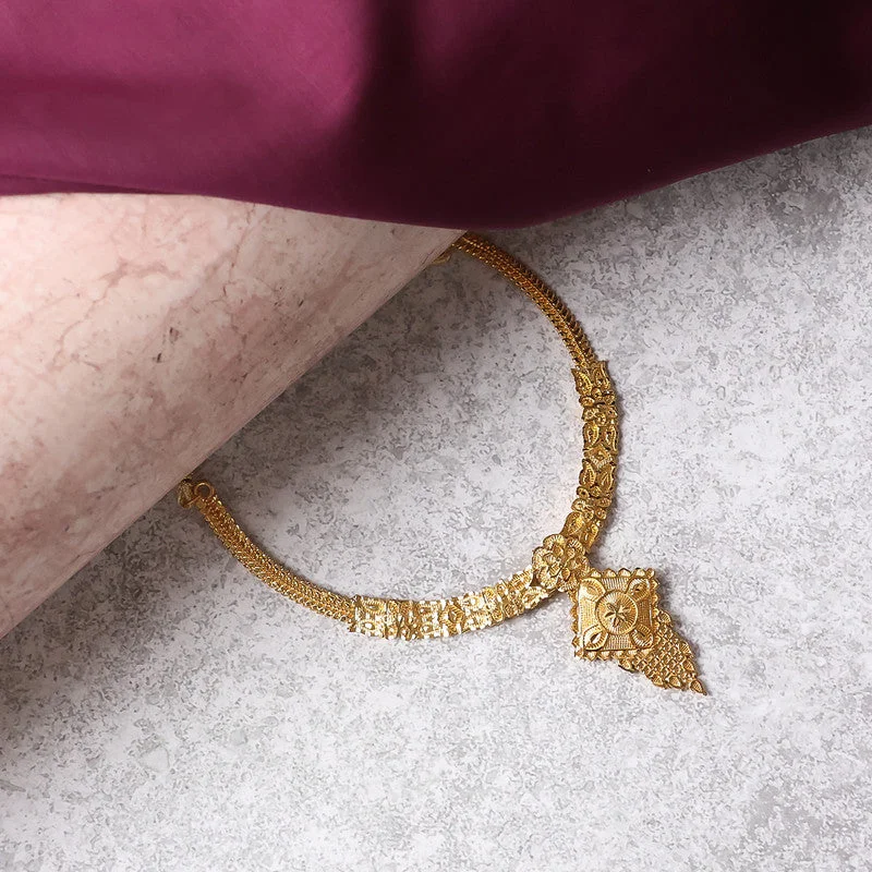 This beautifully crafted choker necklace set features a refined floral drop pendant that adds a graceful and traditional charm to any ethnic look. The choker band is adorned with intricate engraved detailing and textured patterns, giving it a rich and luxurious appearance. The matching earrings mirror the same artistry, creating a perfectly coordinated and elegant ensemble. Ideal for festive celebrations, wedding functions, and cultural gatherings, this jewellery set offers timeless beauty with a smooth, premium finish. It’s a perfect choice for women who appreciate classic, understated, yet striking traditional designs.