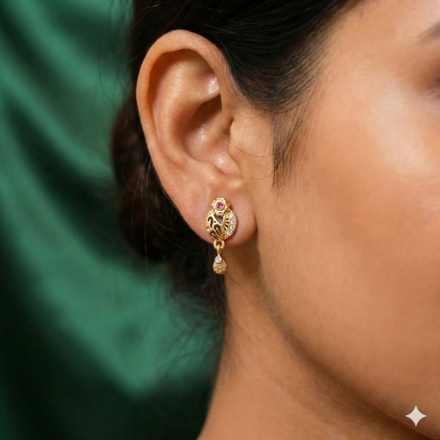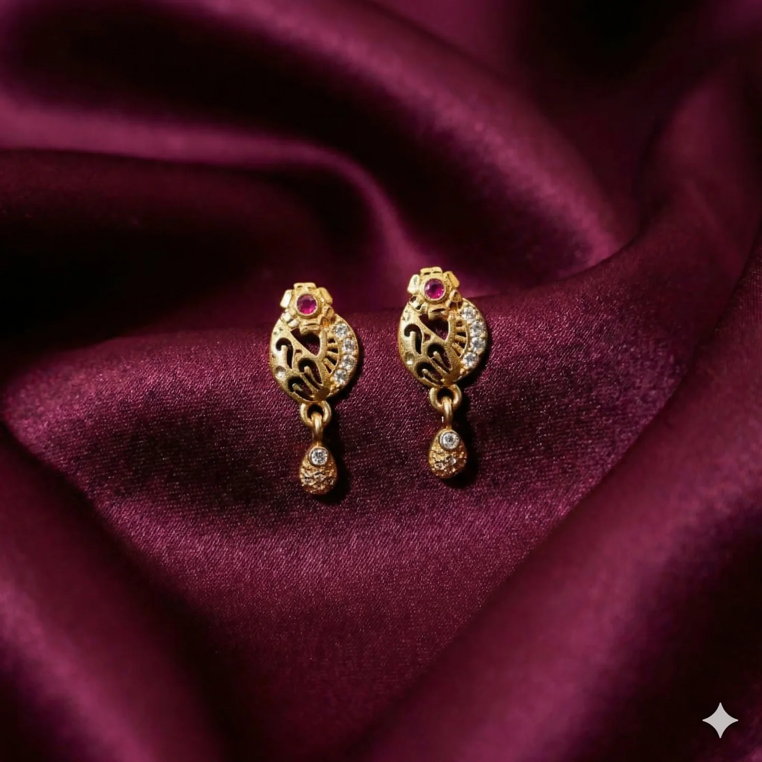 Designed for the woman who appreciates the fine balance between tradition and modern luxury, these earrings feature an intricate peacock motif crafted in a rich, gold-toned finish. The delicate filigree work is accented by a vibrant, ruby-pink center stone and a crescent of shimmering white crystals that capture the light with every move.