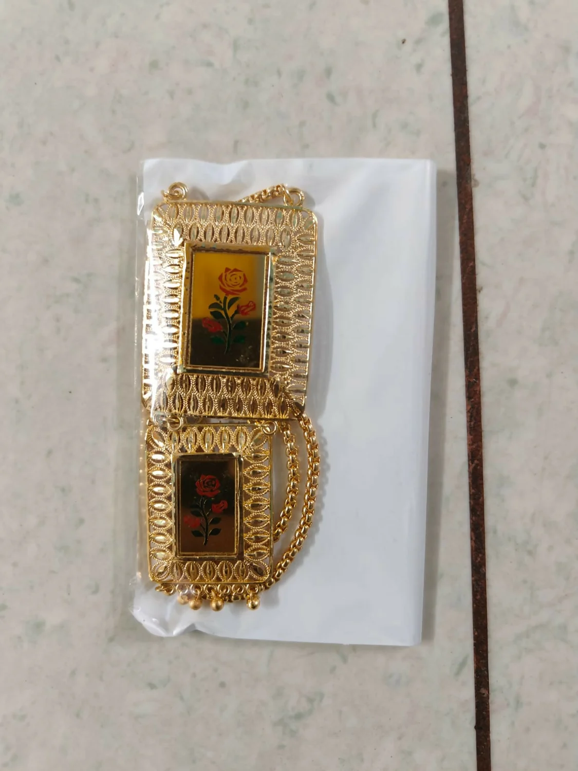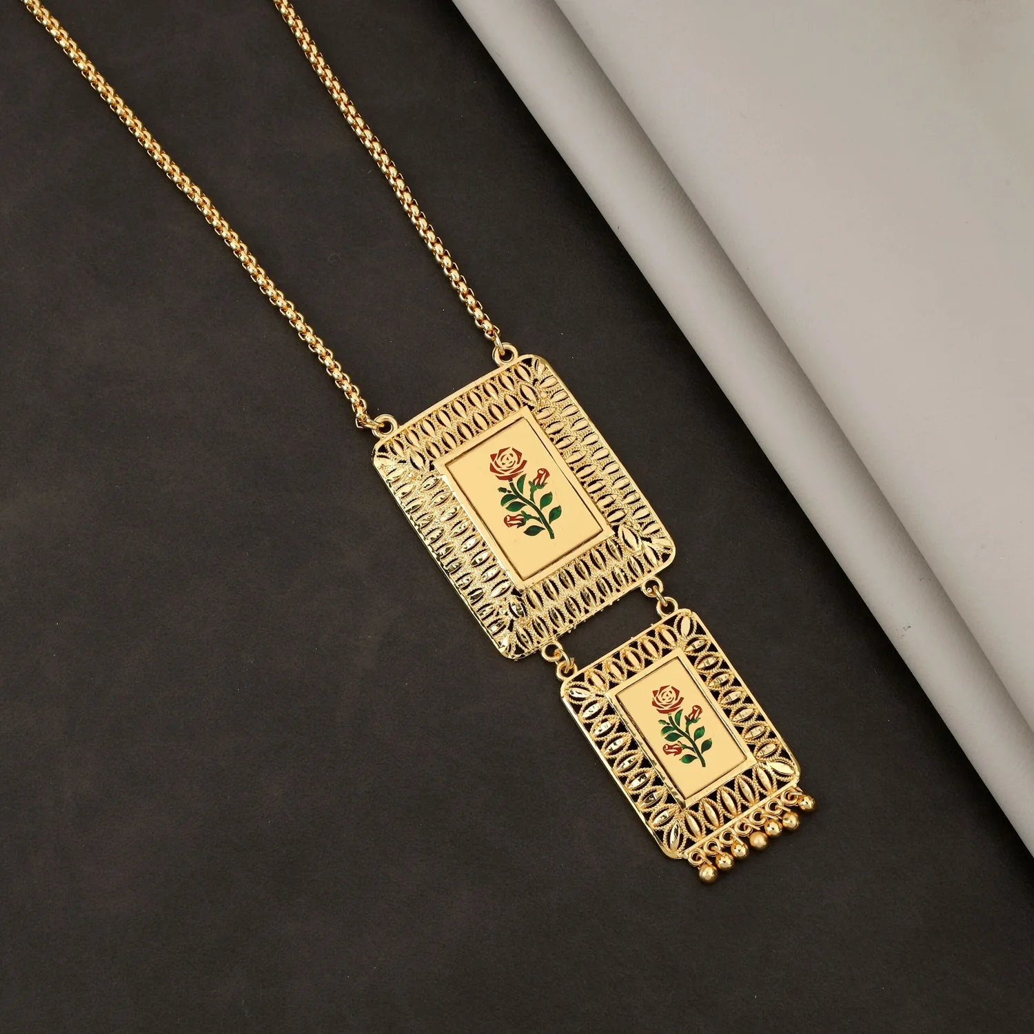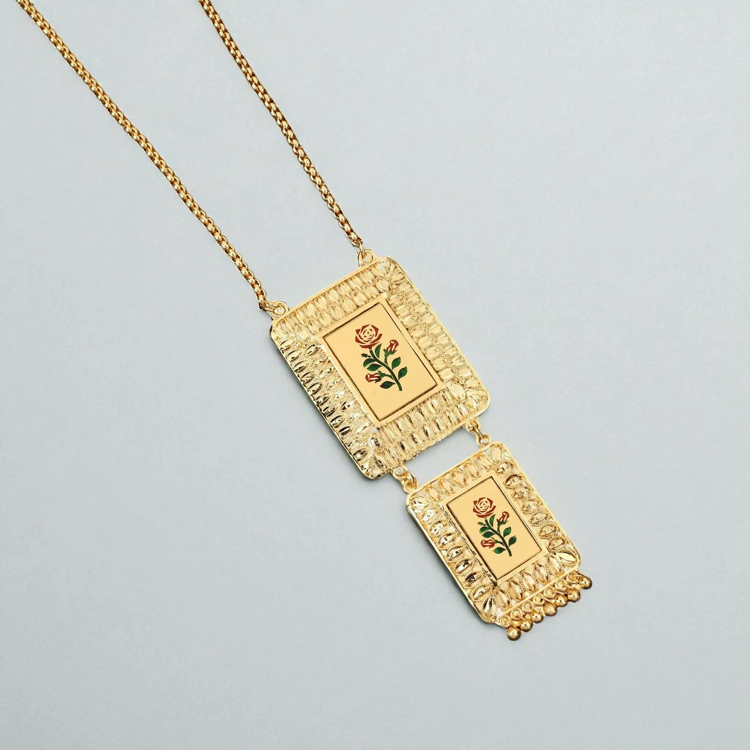 Meenakari Work: The center of each pendant features a smooth, enamel panel with exquisite Meenakari work (colored enameling), depicting a beautiful red and green rose motif. The smaller lower pendant is attached to the larger upper one and features small gold ghungroo (beads) dangling from the bottom, adding a subtle ethnic charm.