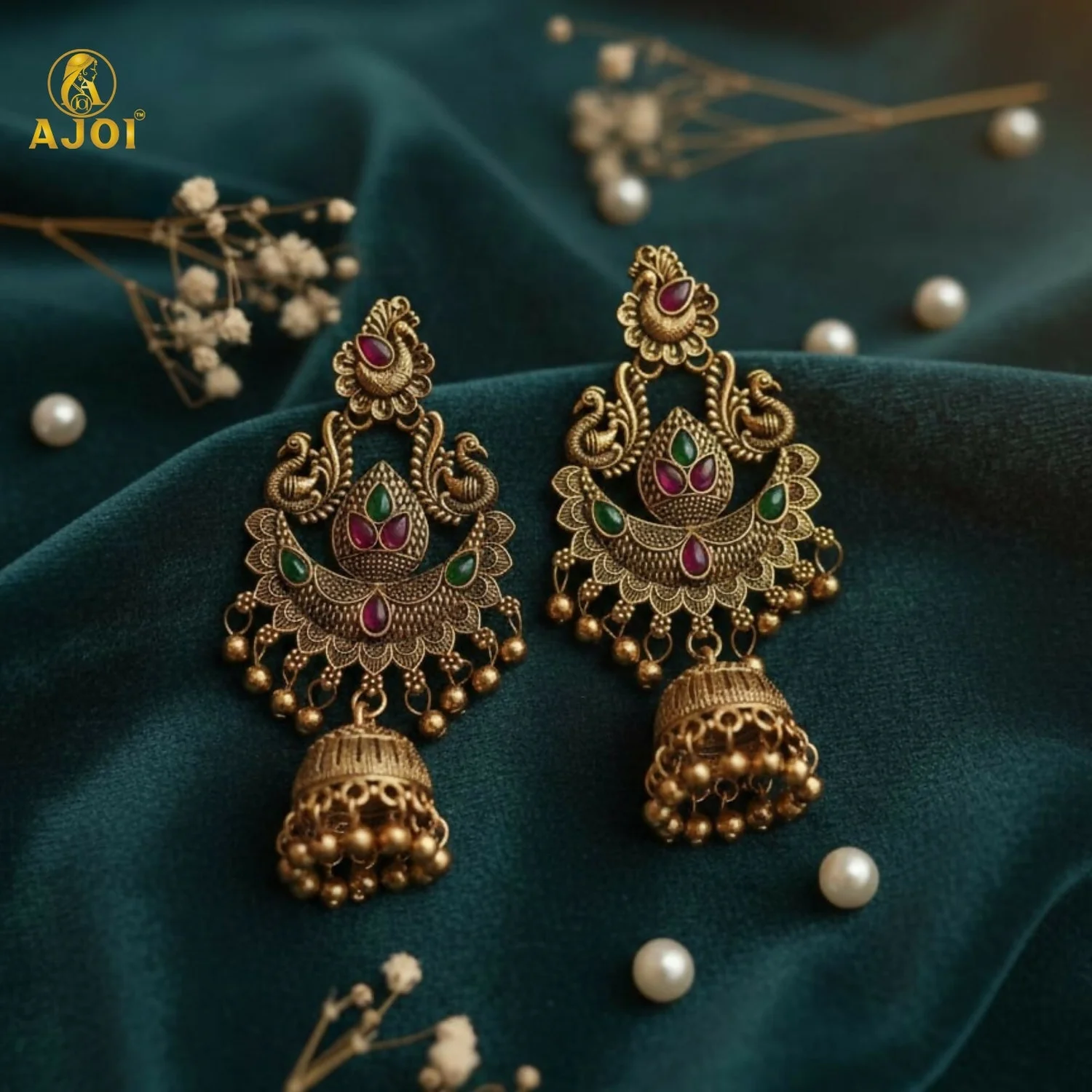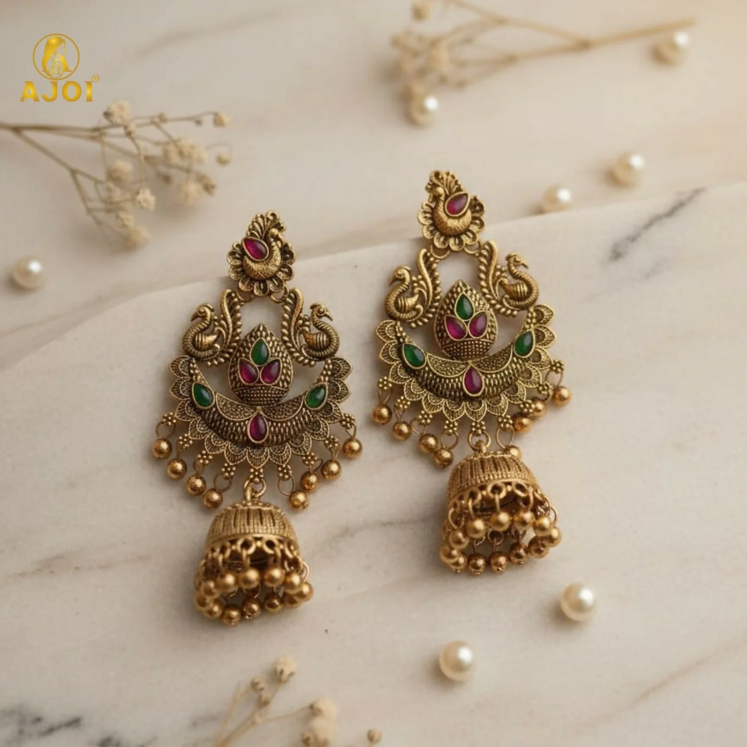 Enhance your ethnic look with these exquisitely crafted traditional peacock design jhumka earrings. Designed with intricate antique gold plating, these earrings feature beautifully detailed peacock motifs adorned with vibrant green and pink stones that add a royal touch. The elegant jhumka drop with delicate golden beads creates graceful movement, making them perfect for festive and traditional wear.