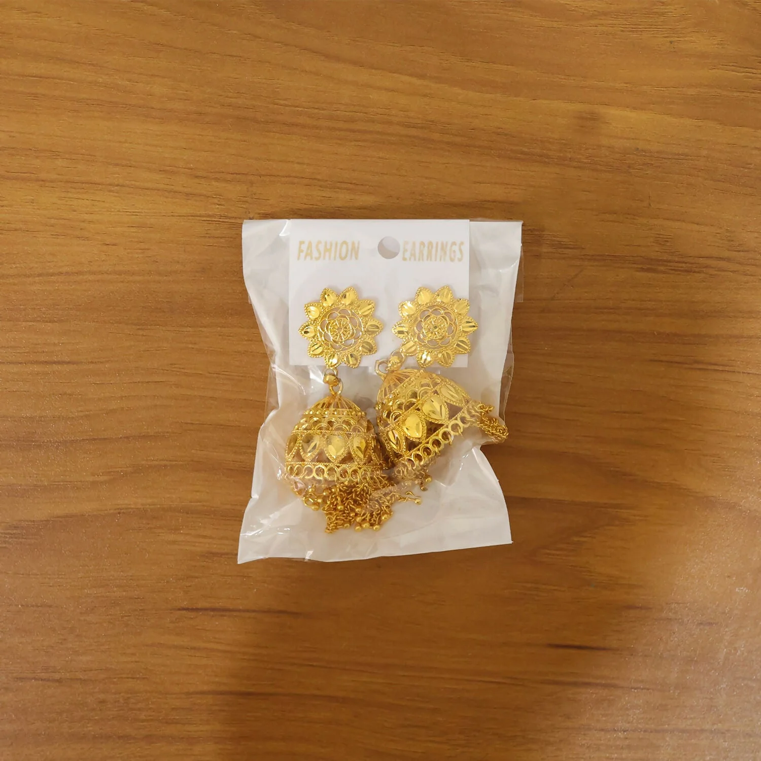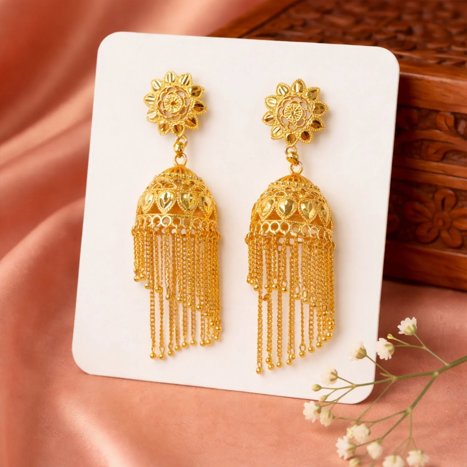 Enhance your ethnic style with these beautifully designed traditional gold tone jhumka earrings featuring a delicate floral stud and intricately crafted dome-shaped drop. The detailed pattern on the jhumka dome combined with multiple fine chain tassels creates a graceful and elegant movement that instantly elevates any look. Inspired by classic Indian jewelry craftsmanship, these earrings bring a rich and luxurious traditional appeal.