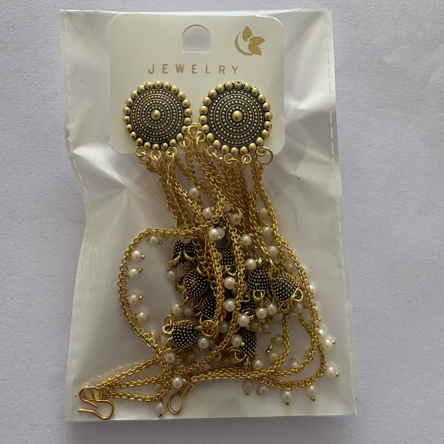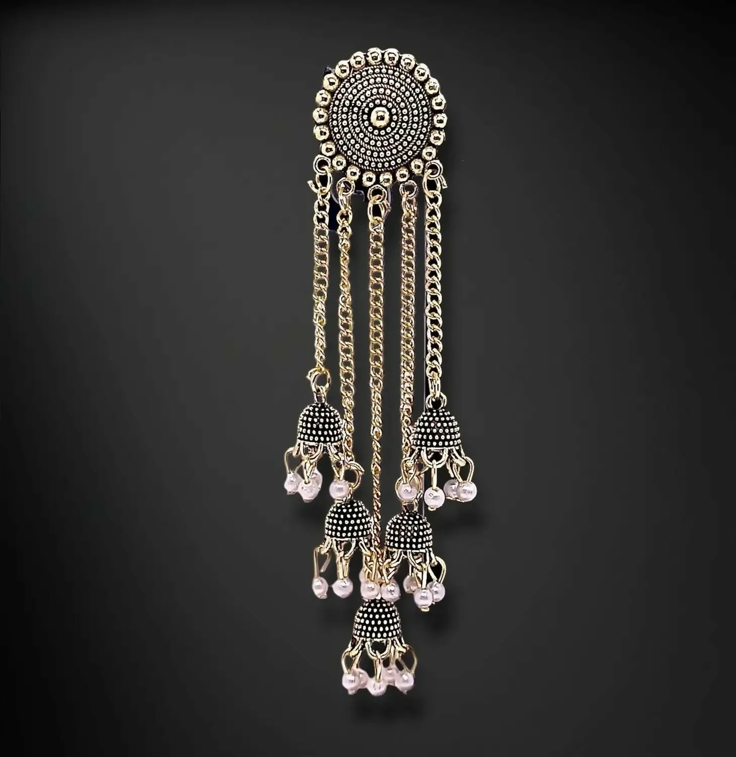 raditional Gold-Tone Jhumka Chain Earrings with Pearl Drops. Beautifully crafted with intricate detailing, these earrings feature a classic circular stud design paired with cascading chains and delicate jhumka danglers. Soft pearl beads accent the chains, creating a graceful movement and luxurious finish.