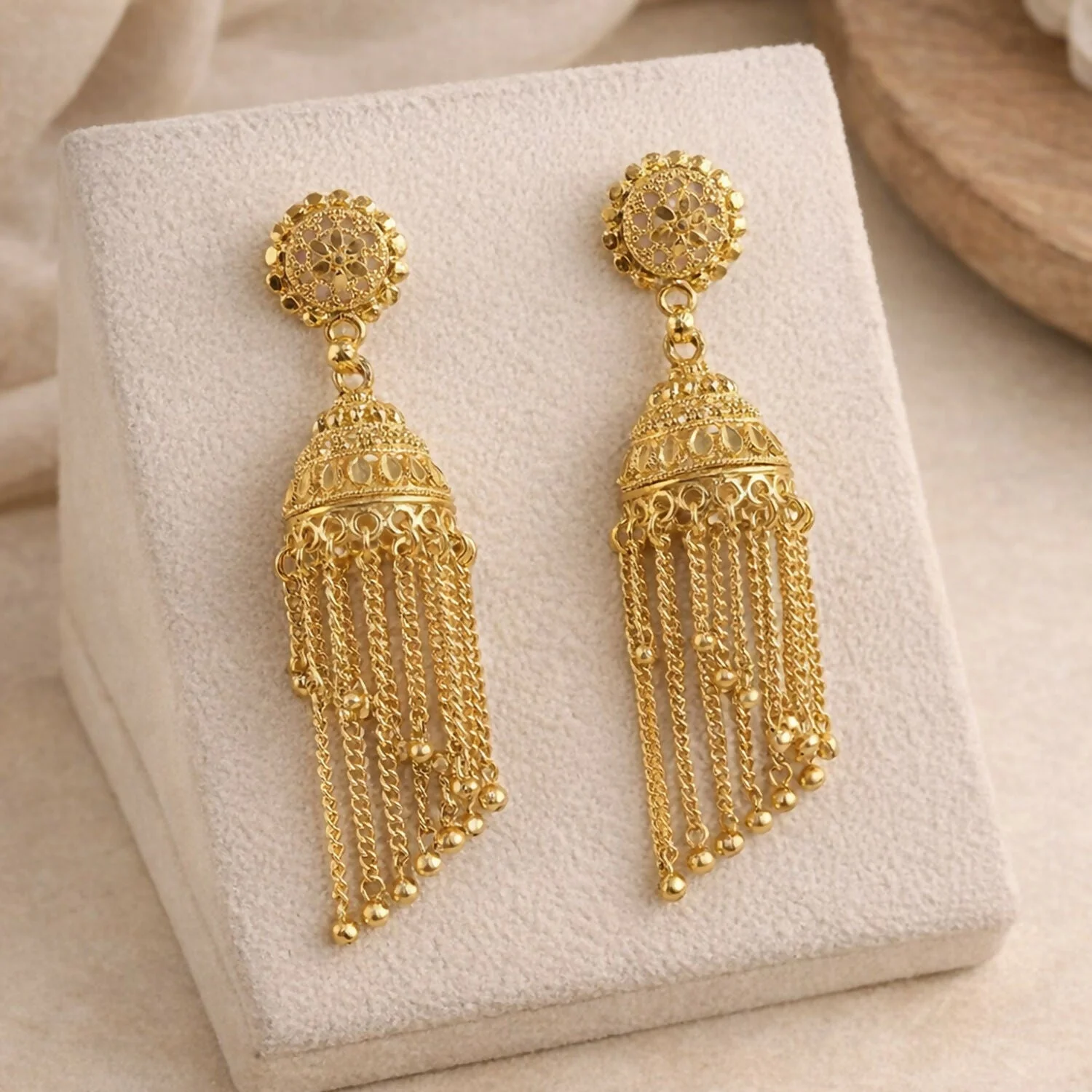 The flowing tassels move gently with every step, adding charm and sophistication to your look. These statement earrings are perfect for pairing with sarees, lehengas, kurtis, and other ethnic outfits. Whether for weddings, festive celebrations, parties, or special occasions, these jhumka earrings elevate your traditional style effortlessly.