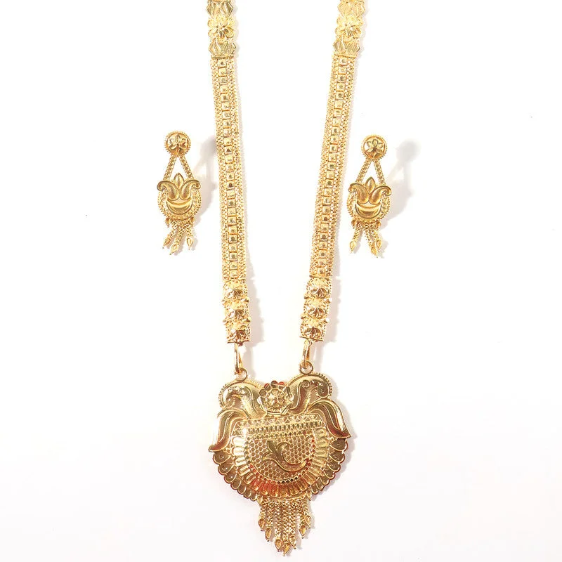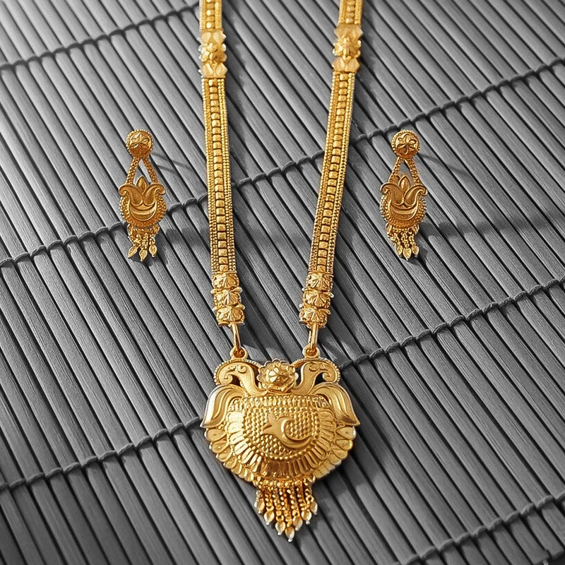 This stunning jewelry set features a richly detailed temple-inspired necklace paired with beautifully coordinated earrings, crafted in an elegant gold-tone finish. The necklace showcases a bold sculpted pendant with intricate motifs, adding a regal and timeless aesthetic. Its textured dual-chain design enhances the traditional look, making it perfect for festive occasions and cultural celebrations. The matching earrings mirror the same craftsmanship, completing the set with graceful harmony. Ideal for bridal wear, ethnic outfits, and special events, this set elevates any ensemble with its classic charm and luxurious artistry.