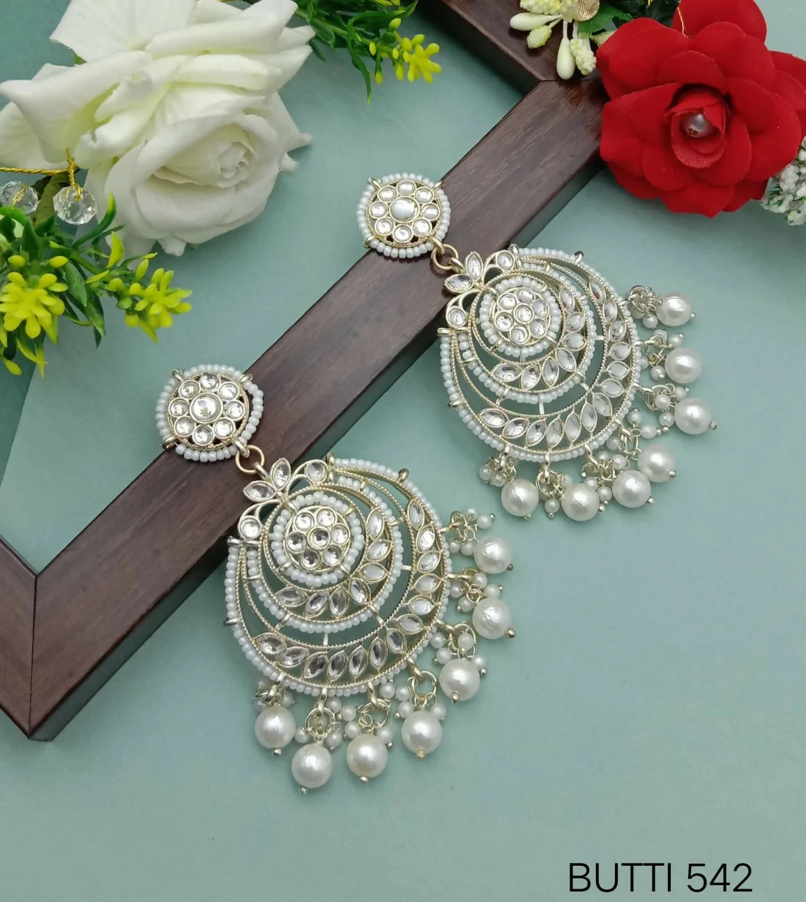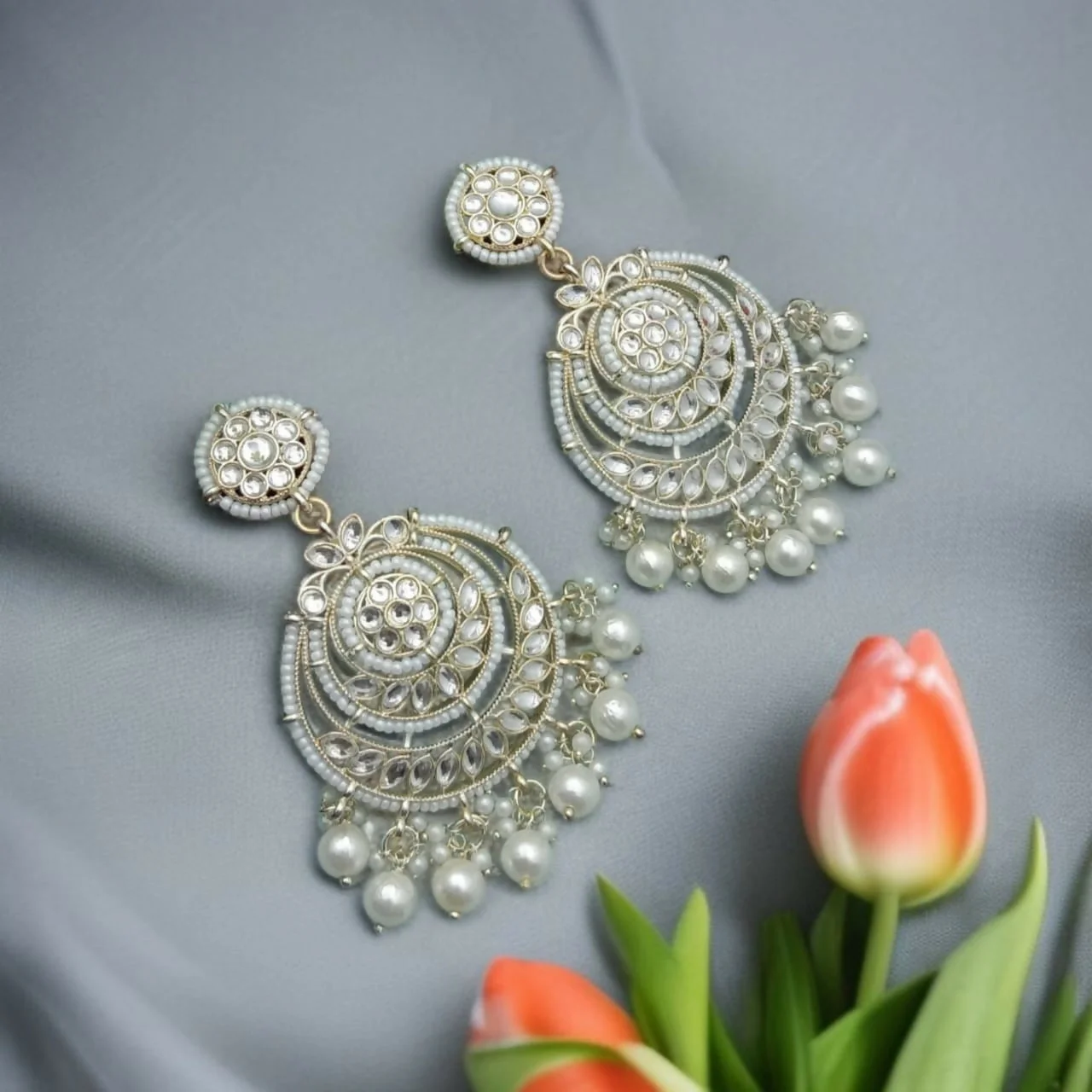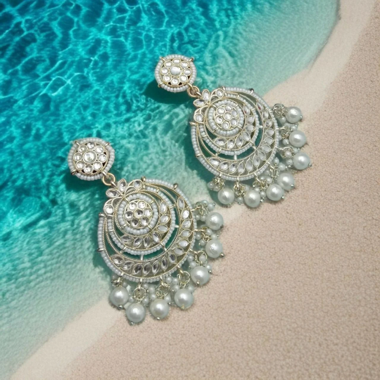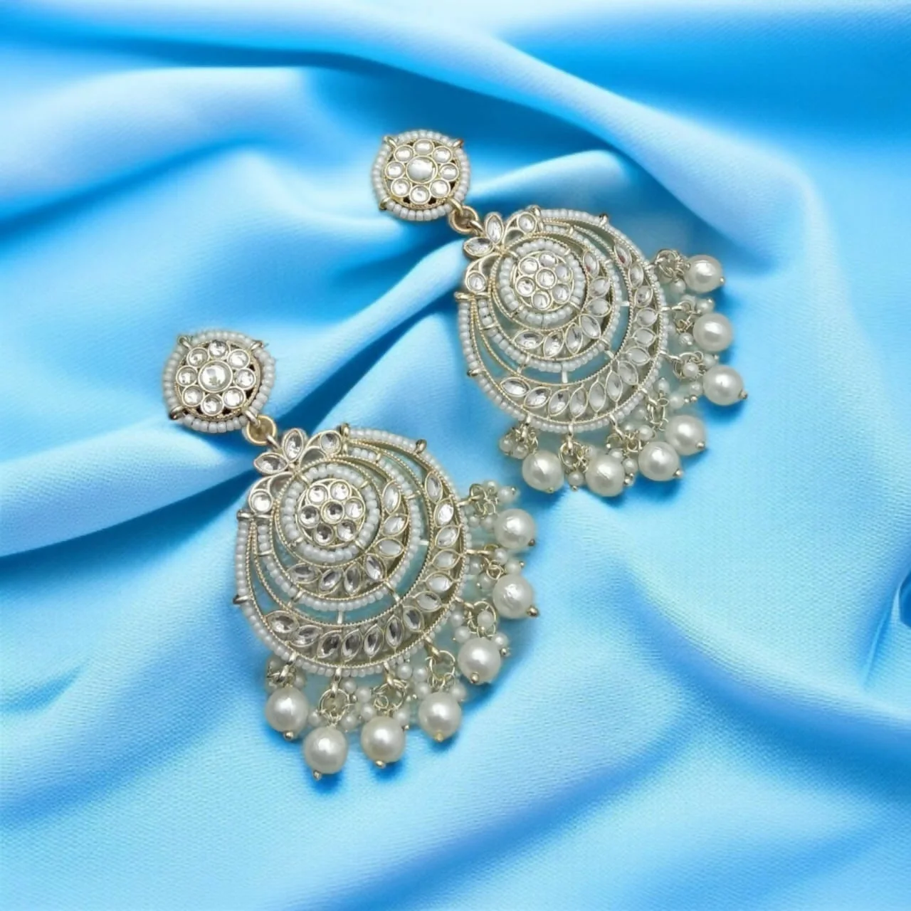 Be the first to review Traditional Gold-Toned Chandbali Earrings with Kundan Stones and Pearl Drops!