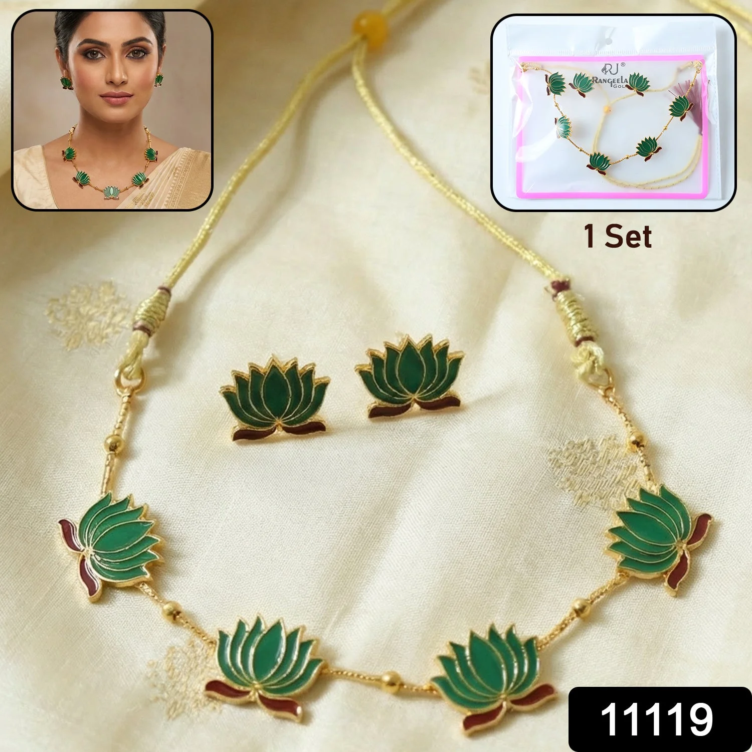 This elegant lotus-inspired necklace and earrings set features beautifully crafted green lotus motifs arranged along a delicate chain for a refined traditional look. The necklace comes with an adjustable thread closure, allowing a comfortable and customized fit. Paired with matching lotus stud earrings, this set adds grace and cultural charm to ethnic outfits. Its balanced design makes it suitable for daily festive wear as well as special ceremonial occasions.