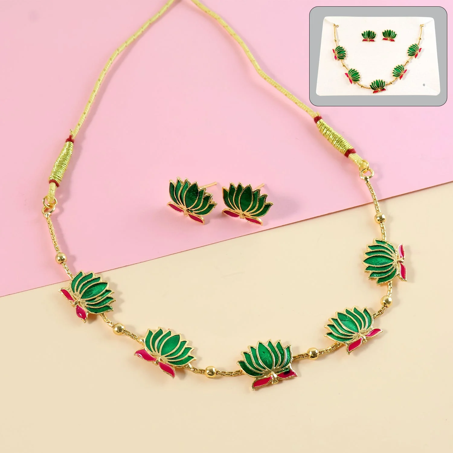 Traditional Green & Lotus Motif Jewellery Set for Women – Elegant Ethnic Necklace with Matching Lotus Stud Earrings, Festive & Cultural Wear Accessory Set
