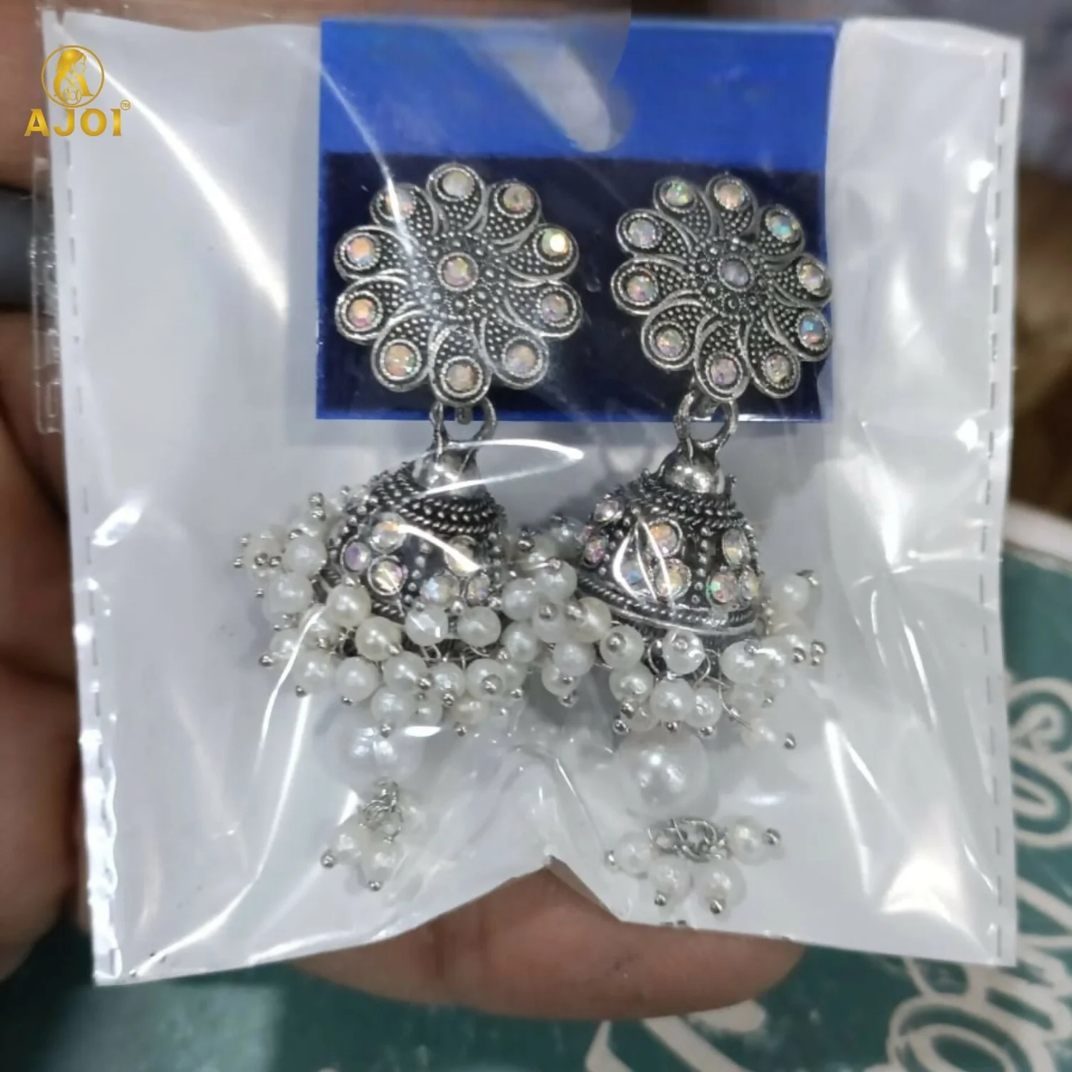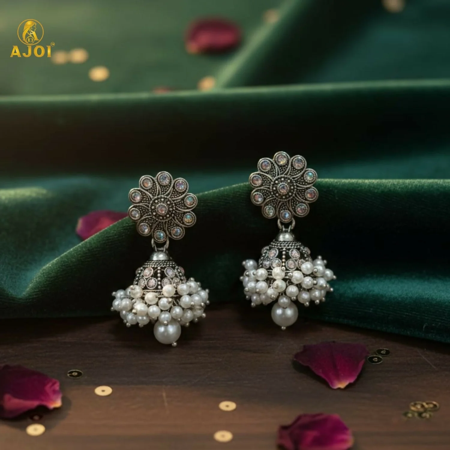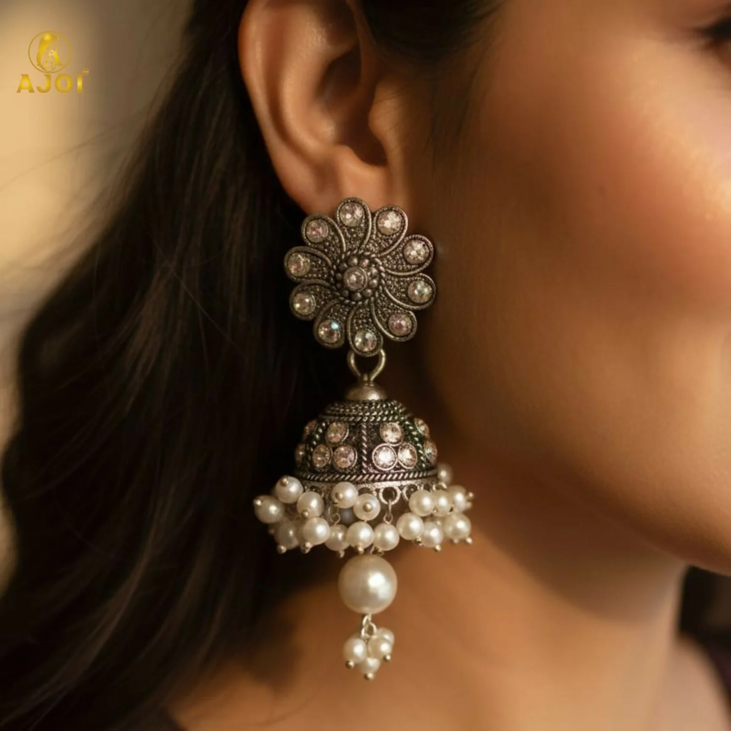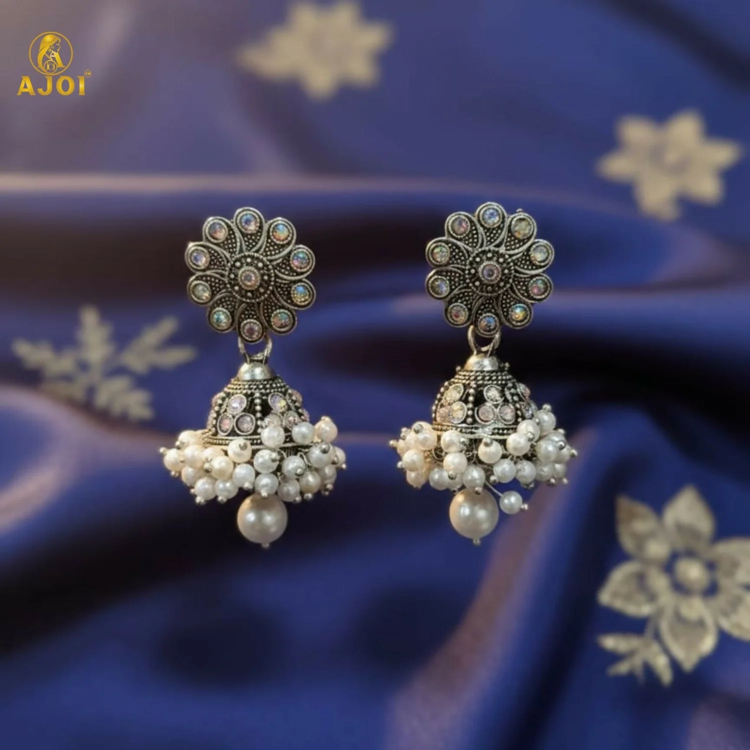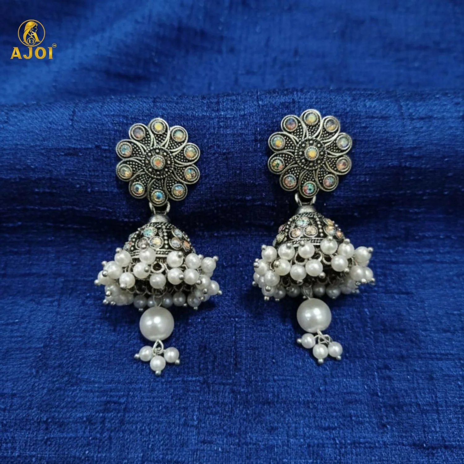 Celebrate timeless Indian tradition with these beautifully crafted oxidised silver round jhumka earrings. Featuring an intricately designed circular stud inspired by classic Indian motifs, these earrings are paired with dome-shaped jhumkas adorned with delicate pearl clusters. The elegant pearl drop at the base adds graceful movement and charm. Perfect for weddings, festivals, puja, and ethnic occasions, these earrings complement sarees, lehengas, and salwar suits effortlessly. A must-have accessory for lovers of traditional Indian jewellery.