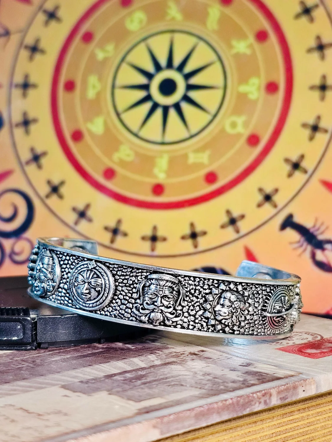 Traditional Navgrah Bracelet – Intricately Carved Nine Planet Design Adjustable Metal Kada for Men & Women