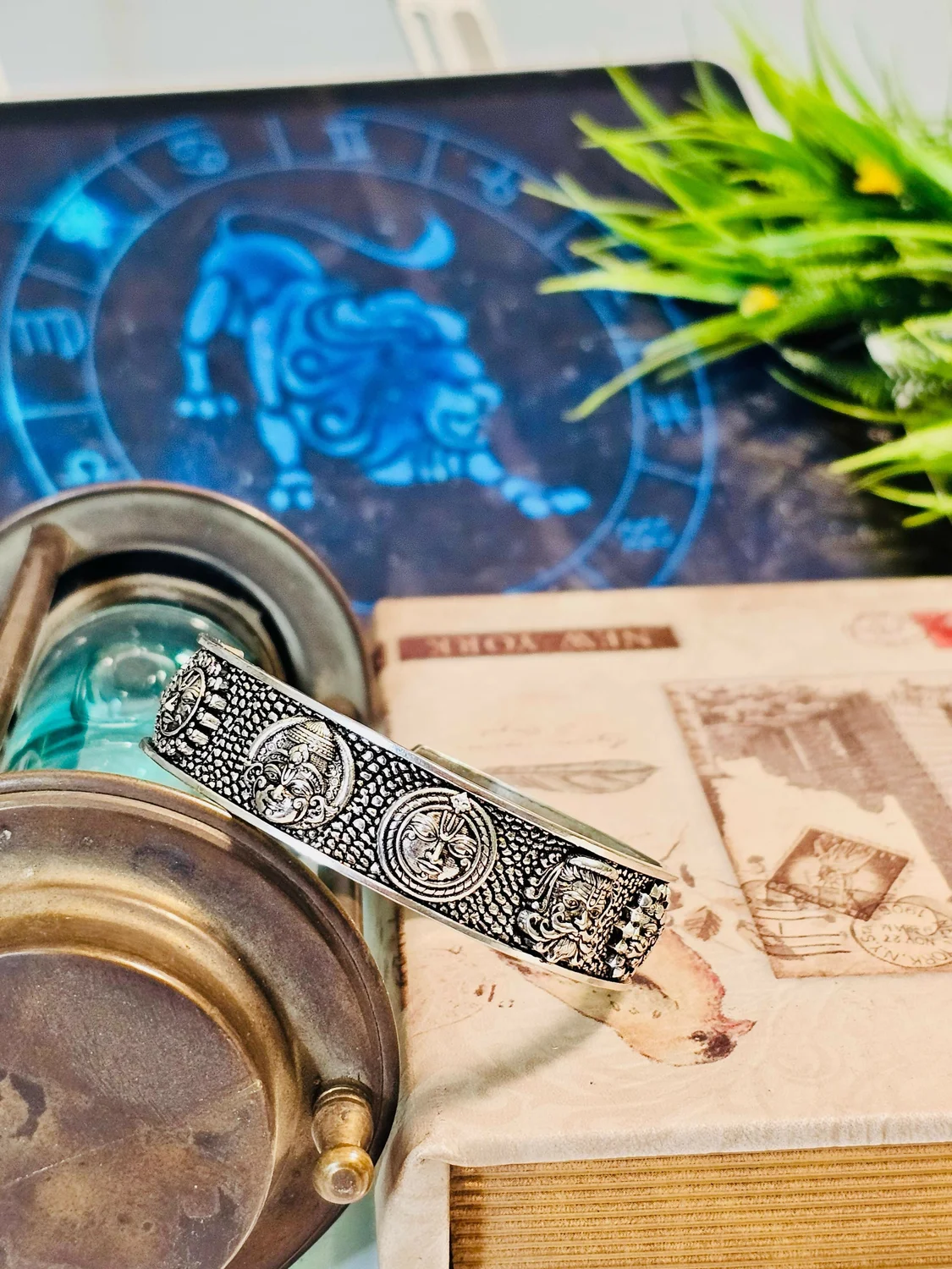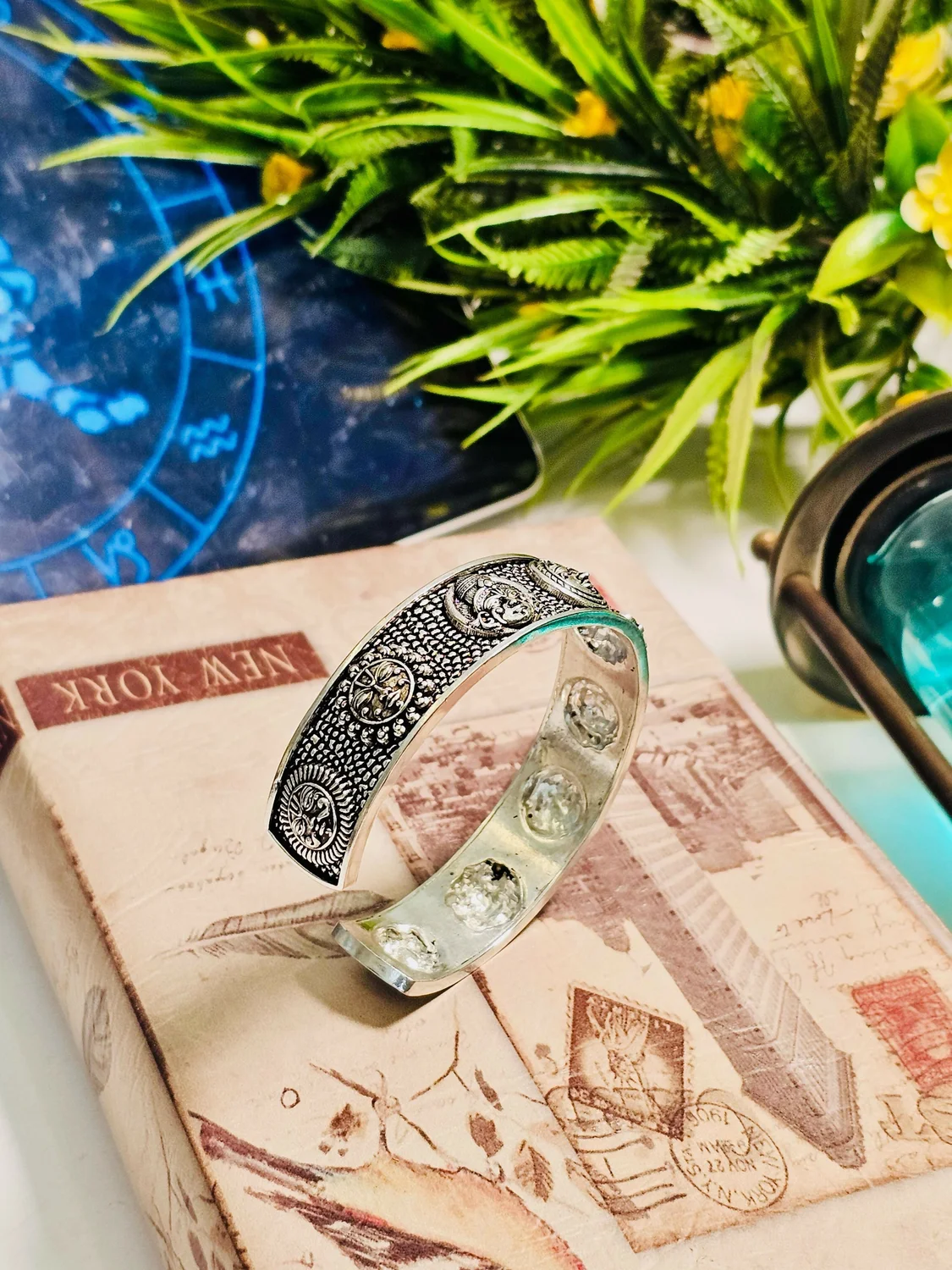 This traditional Navgrah bracelet features detailed engravings representing the nine celestial planets from Vedic astrology. Designed with a heritage-inspired metal finish, it blends spiritual symbolism with artisanal craftsmanship. The adjustable kada style ensures a comfortable fit for both men and women, making it a meaningful accessory for everyday wear or special occasions. Ideal for astrology enthusiasts, spiritual seekers, and those who appreciate traditional Indian jewelry.
