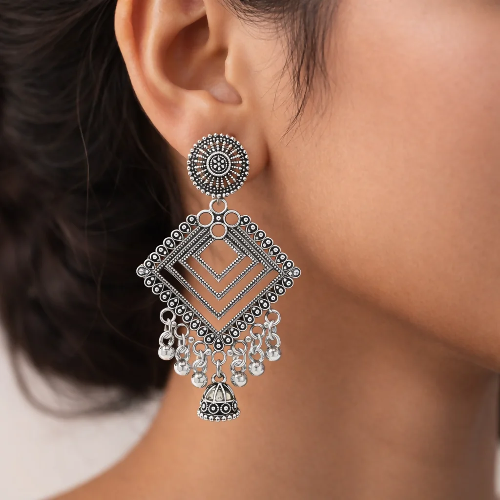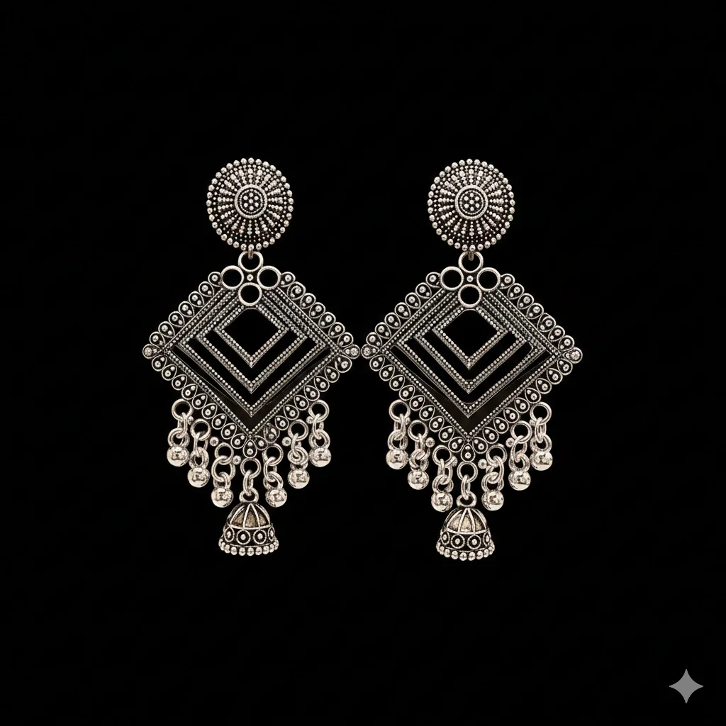 This elegant pair of oxidised silver statement earrings features a beautifully detailed geometric design with intricate patterns and graceful dangling ghungroo charms. Crafted with a rich oxidised finish, the bold square motif combined with traditional detailing creates a perfect balance of modern and ethnic style. Lightweight and comfortable to wear, these earrings are ideal for festivals, weddings, parties, and everyday ethnic or Indo-western looks. A versatile and timeless jewellery piece that pairs effortlessly with sarees, kurtis, lehengas, and fusion outfits.