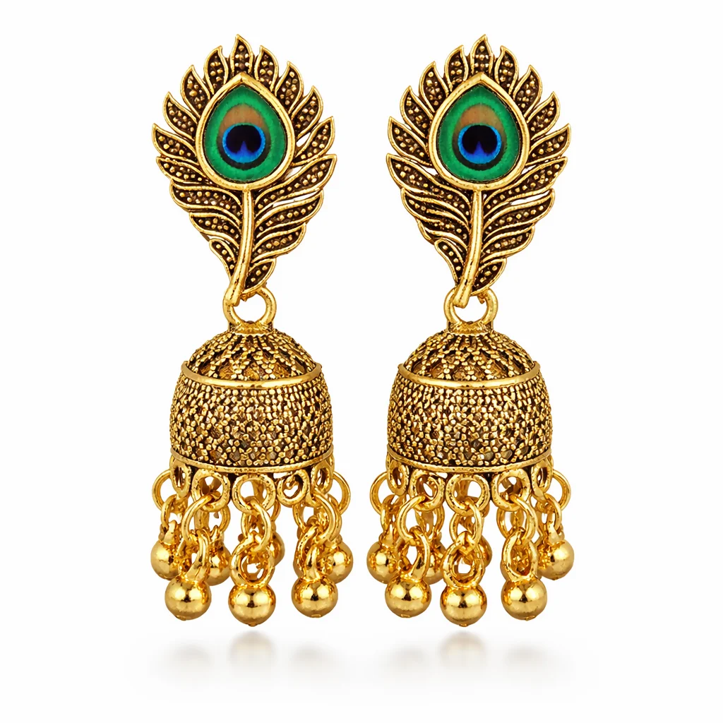 These stunning gold-tone earrings feature a graceful peacock feather-inspired design at the top, highlighted with a vibrant green and blue enamel detail that adds a royal touch. The intricately crafted dome-shaped jhumka is adorned with delicate texture work and finished with tiny dangling gold beads that create beautiful movement. Perfect for weddings, festive occasions, and traditional outfits, these statement earrings blend elegance with heritage charm, making them a standout addition to any jewellery collection.