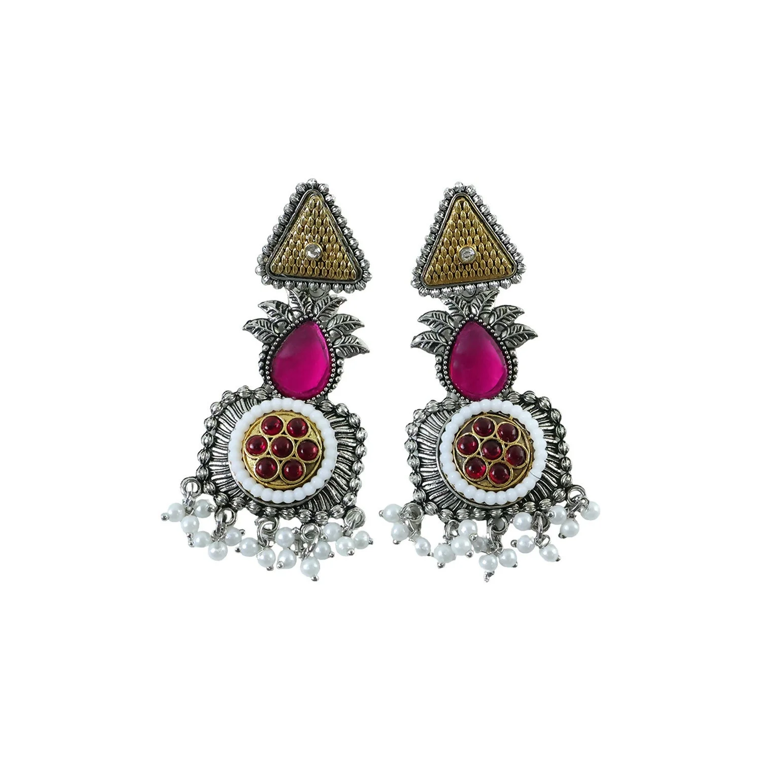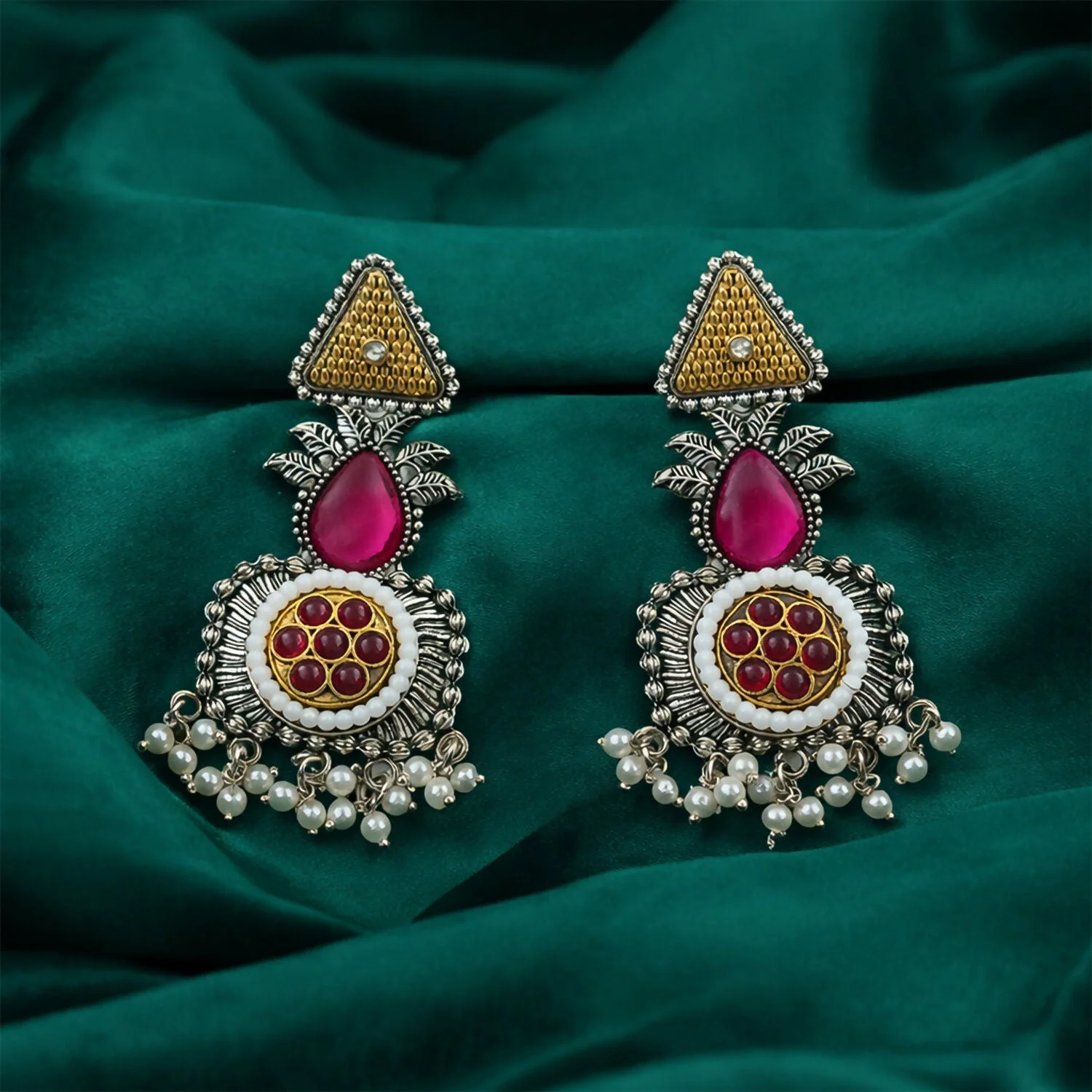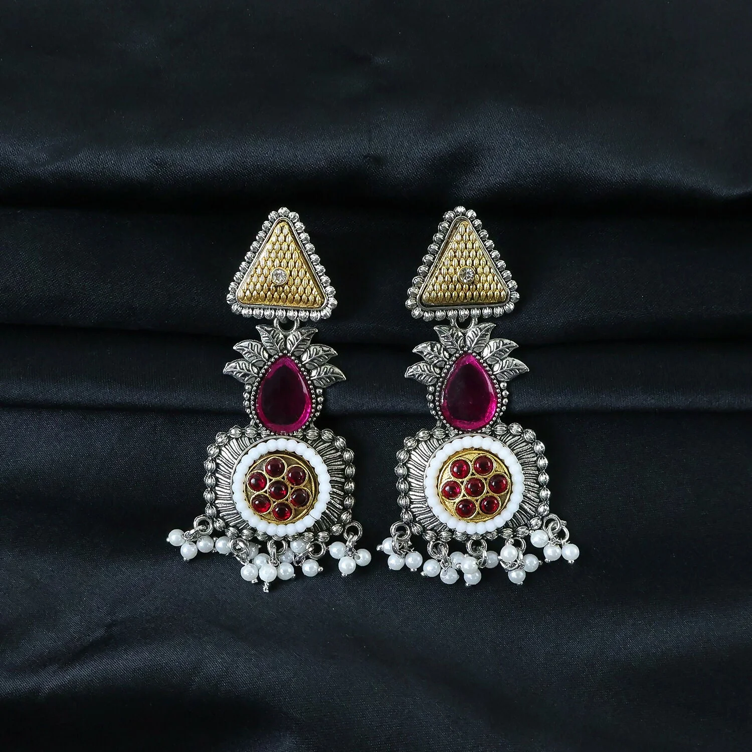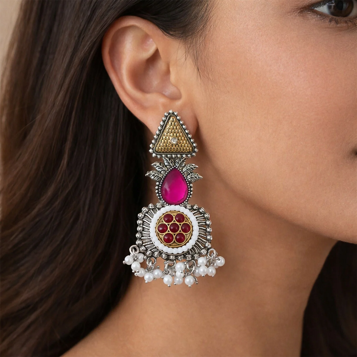 Add a touch of timeless elegance to your jewelry collection with these beautifully crafted oxidized silver statement earrings. Designed with a striking blend of traditional artistry and bold color, the earrings begin with a textured gold-tone triangular stud that brings a unique geometric charm.