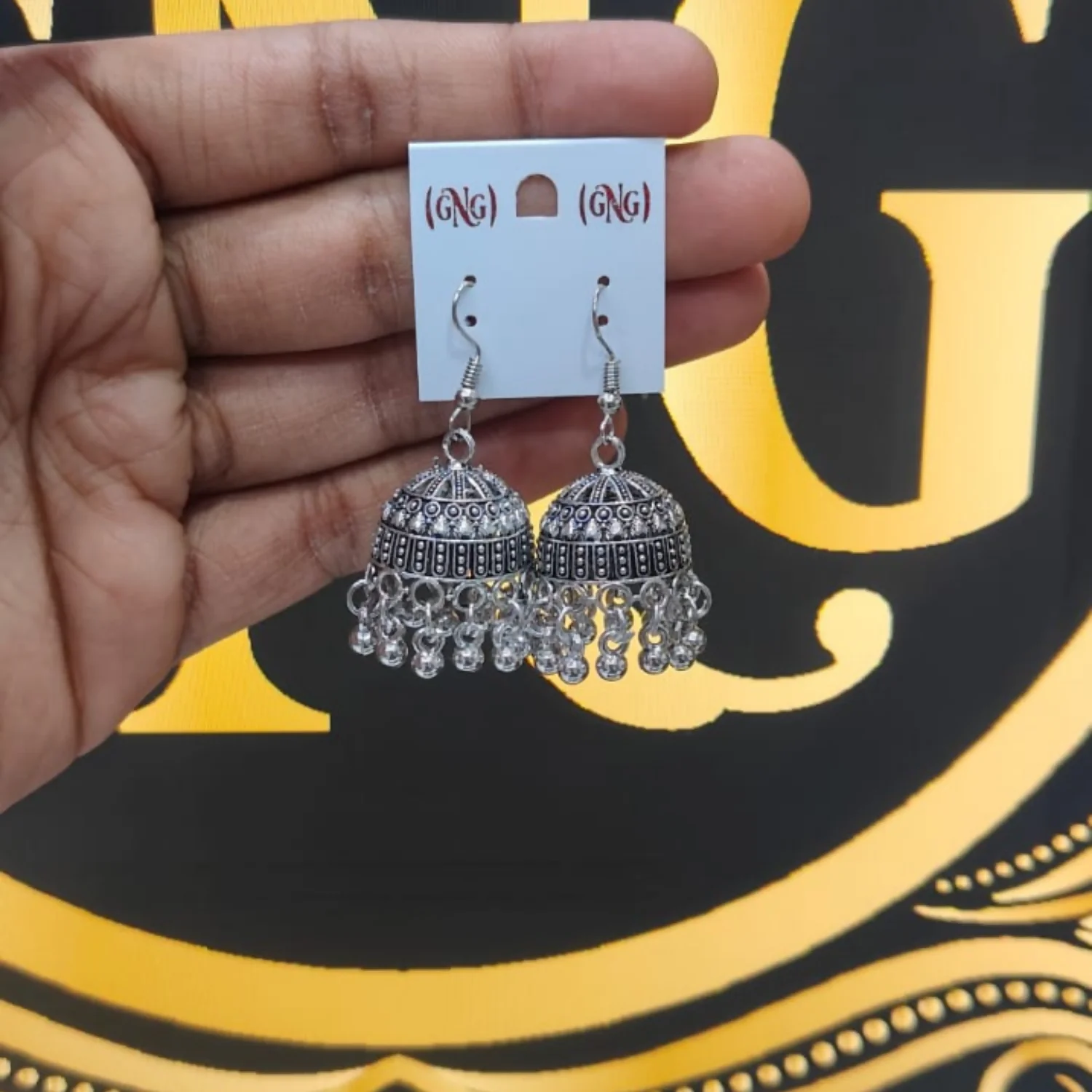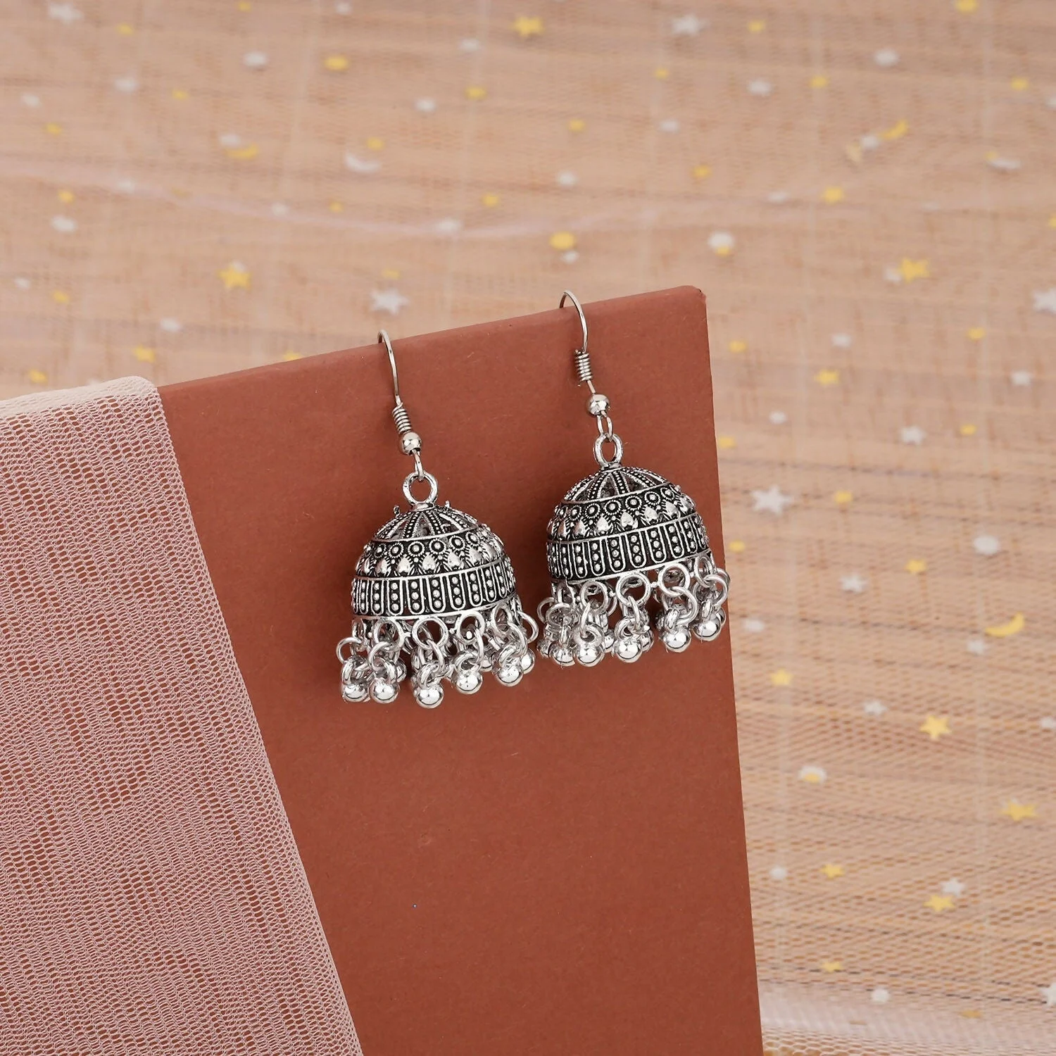 Enhance your ethnic look with these beautifully designed oxidized silver jhumka earrings. Featuring intricate traditional patterns and delicate hanging ghungroo beads, these jhumkas add a graceful and timeless charm to any outfit. Perfect to pair with sarees, kurtis, lehengas, and fusion outfits.