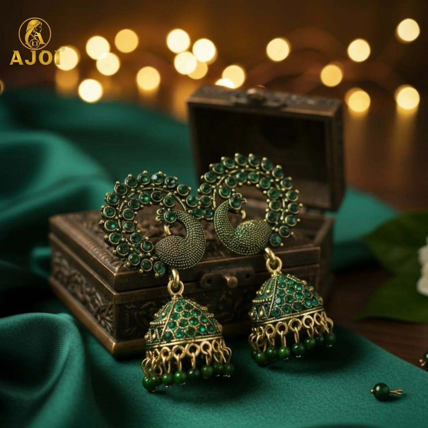 Finished in antique gold tones and accented with dangling green beads, these earrings are ideal for weddings, festive occasions, and grand celebrations. Designed to stand out while remaining comfortable, they elevate sarees, lehengas, and ethnic ensembles effortlessly.