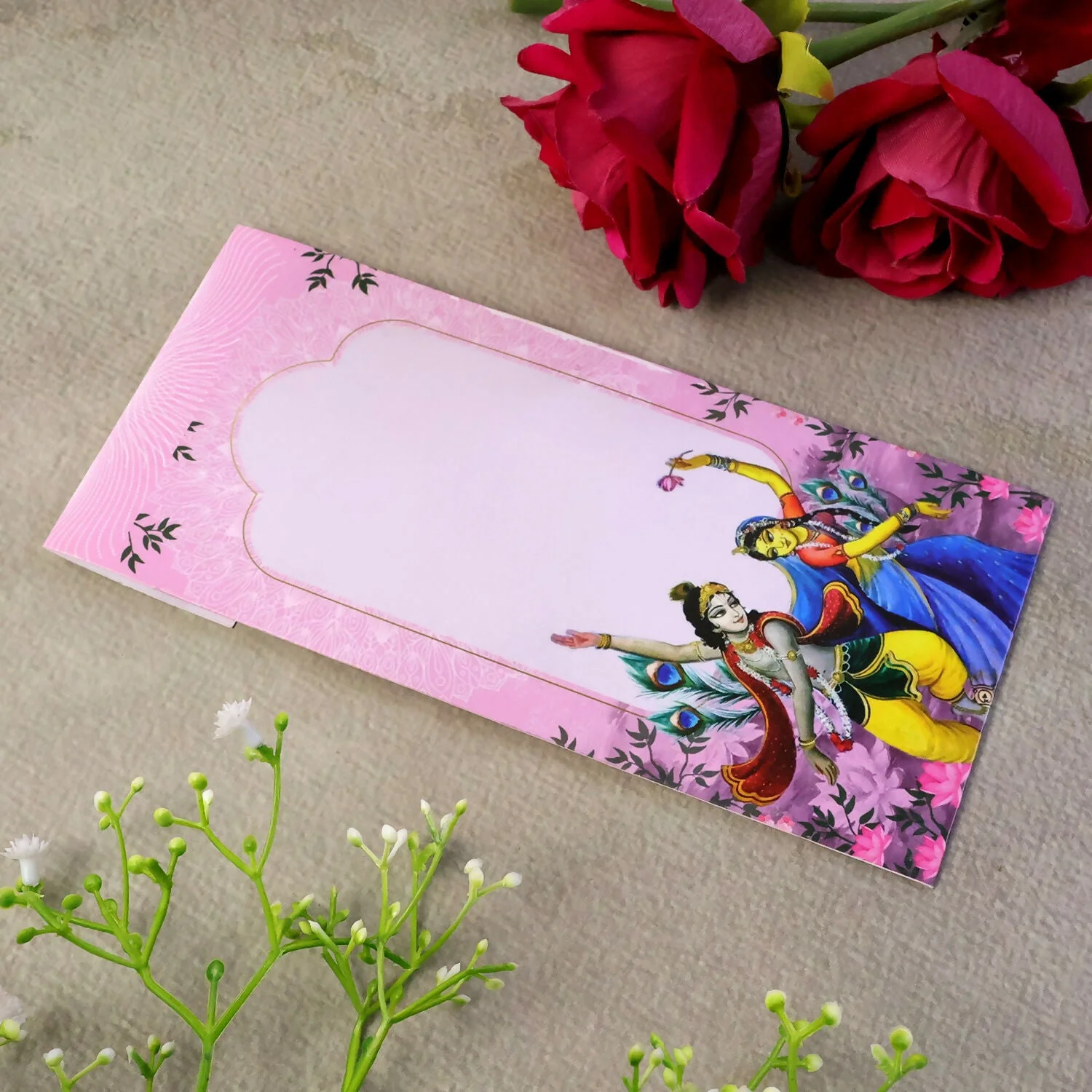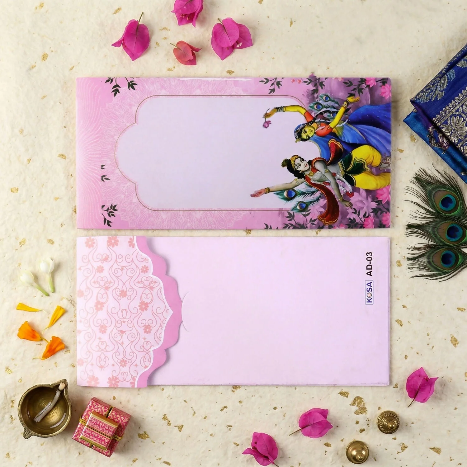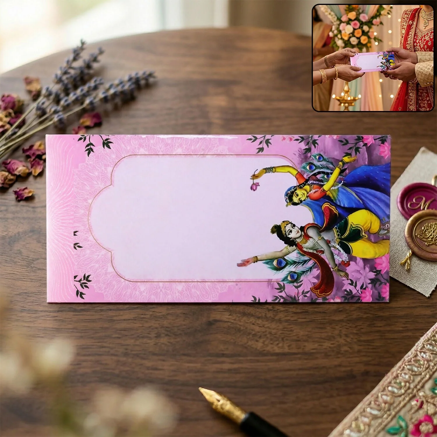 Celebrate love, devotion, and tradition with these beautifully designed Radha Krishna themed shagun envelopes. Featuring an artistic depiction of Radha and Krishna in a graceful dancing pose, these envelopes symbolize eternal love and divine blessings, making them perfect for weddings and auspicious occasions. The soft pink background combined with intricate detailing enhances the overall elegance, giving a premium and festive feel to your gift presentation. Designed with a secure inner pocket, these envelopes ensure that cash or gift notes are neatly held in place while maintaining a refined look. Ideal for weddings, engagements, poojas, and festive gifting, these envelopes add a meaningful and spiritual touch to every celebration.