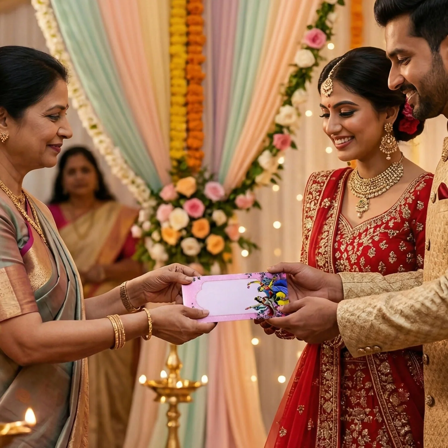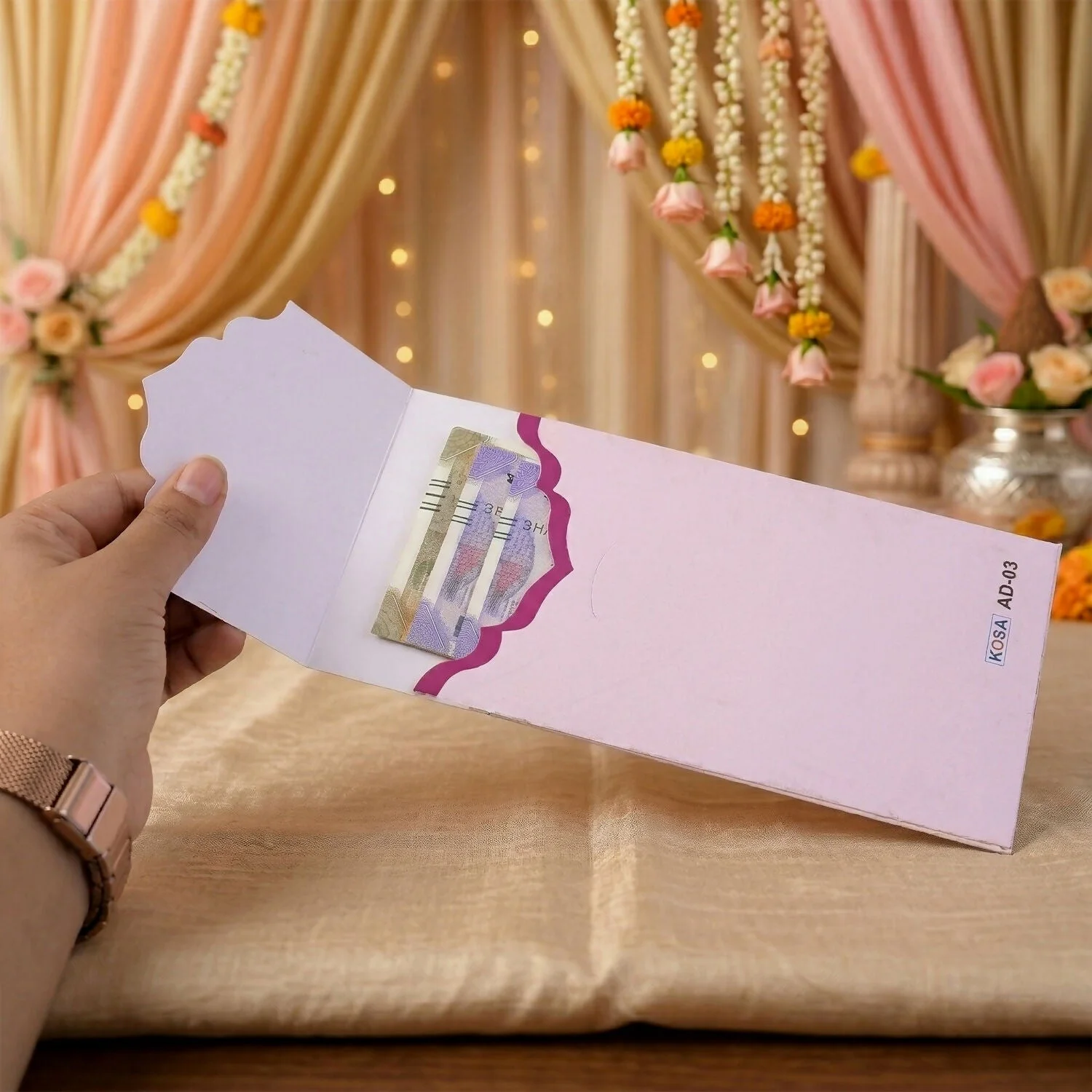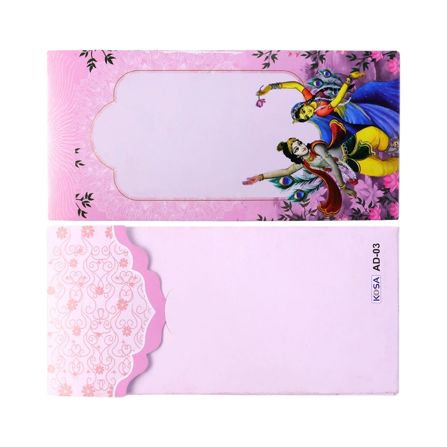 Celebrate love, devotion, and tradition with these beautifully designed Radha Krishna themed shagun envelopes. Featuring an artistic depiction of Radha and Krishna in a graceful dancing pose, these envelopes symbolize eternal love and divine blessings, making them perfect for weddings and auspicious occasions. The soft pink background combined with intricate detailing enhances the overall elegance, giving a premium and festive feel to your gift presentation. Designed with a secure inner pocket, these envelopes ensure that cash or gift notes are neatly held in place while maintaining a refined look. Ideal for weddings, engagements, poojas, and festive gifting, these envelopes add a meaningful and spiritual touch to every celebration.