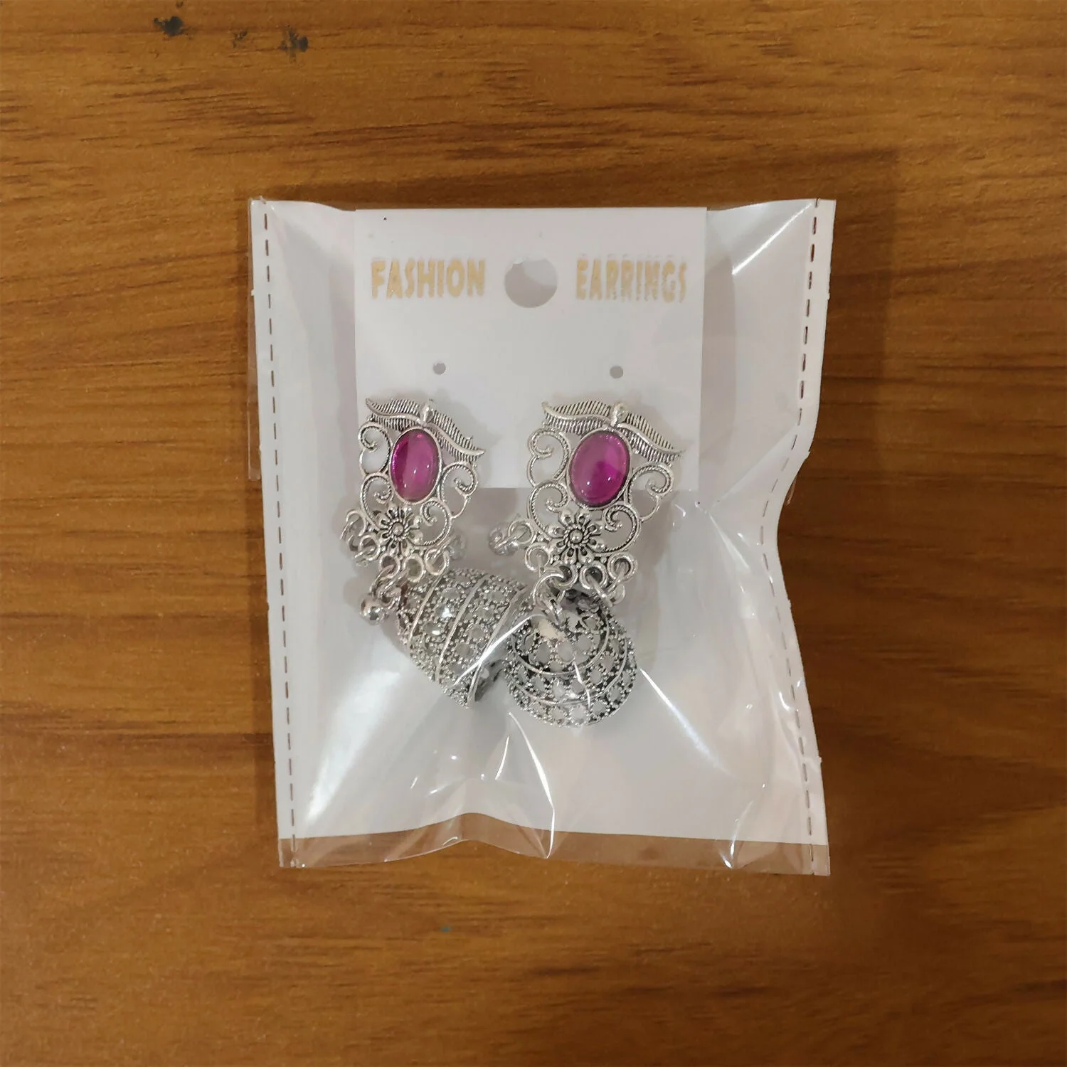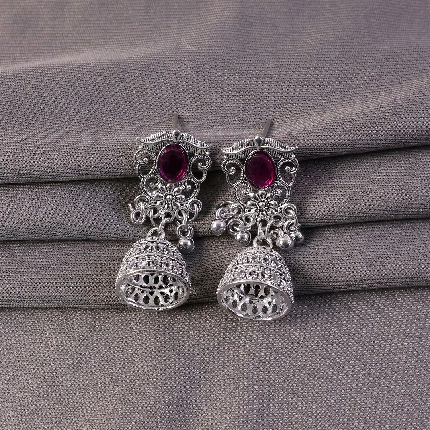These beautiful jhumka earrings feature a traditional Indian design with an oxidized silver finish for an antique, vintage charm. They are typically crafted from a durable base metal alloy, often referred to as German silver or brass, and then silver-plated.