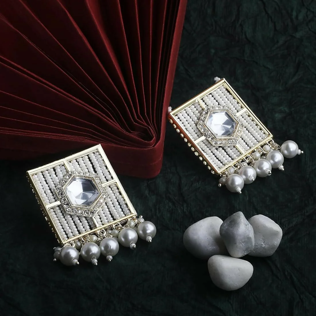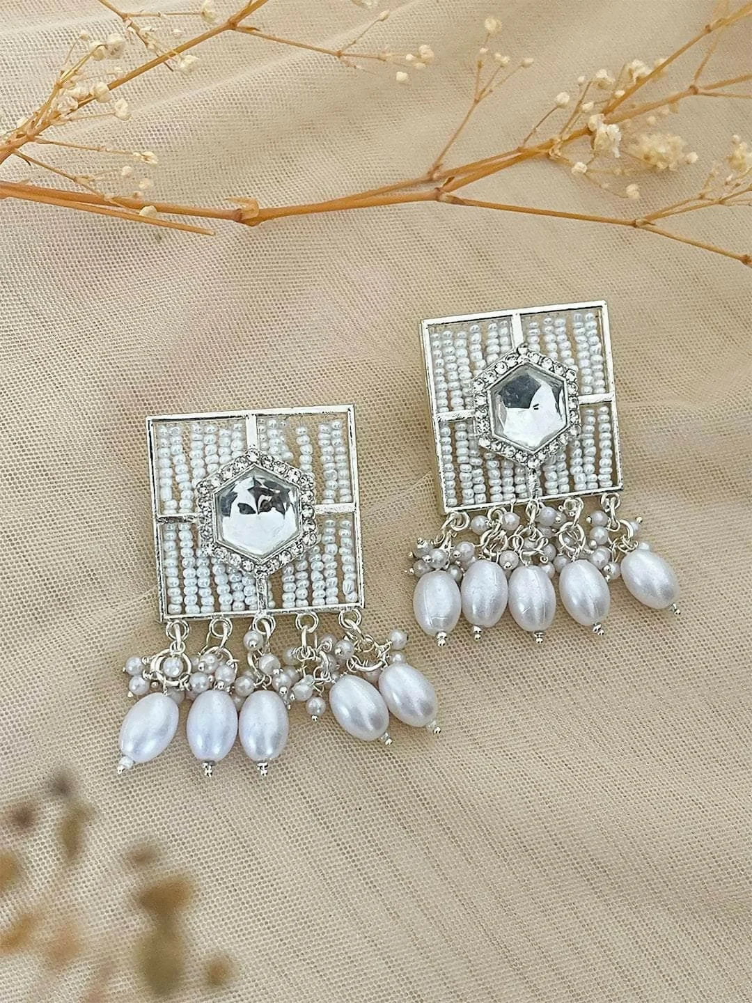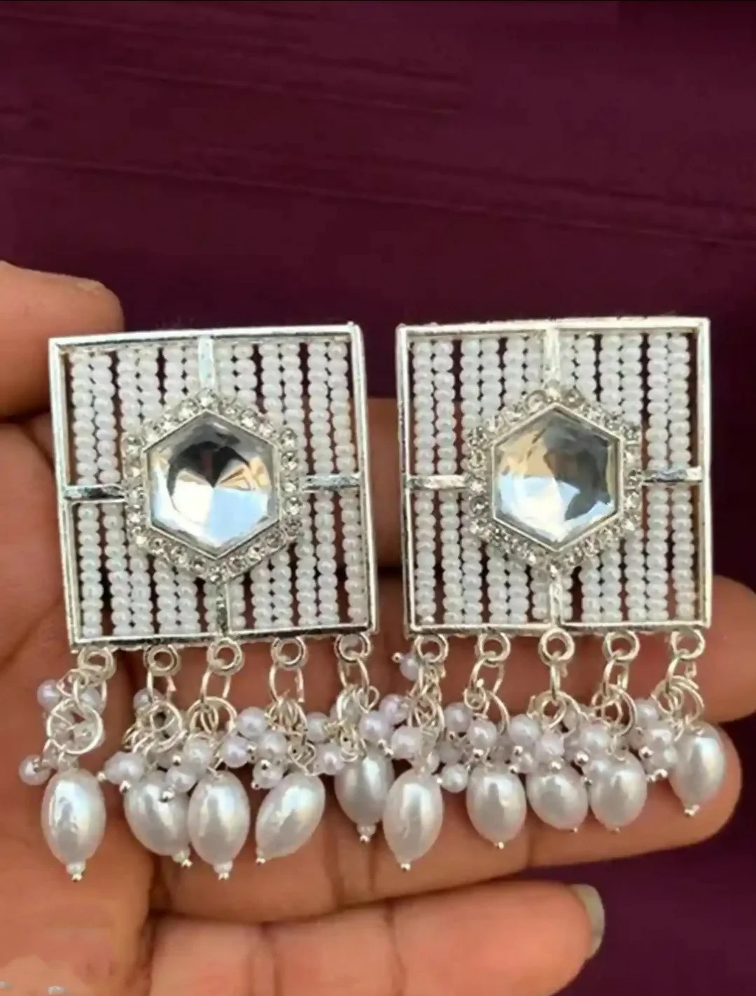 Be the first to review Traditional Silver-Toned Kundan & Pearl Encrusted Chandbali Jhumka Earrings!