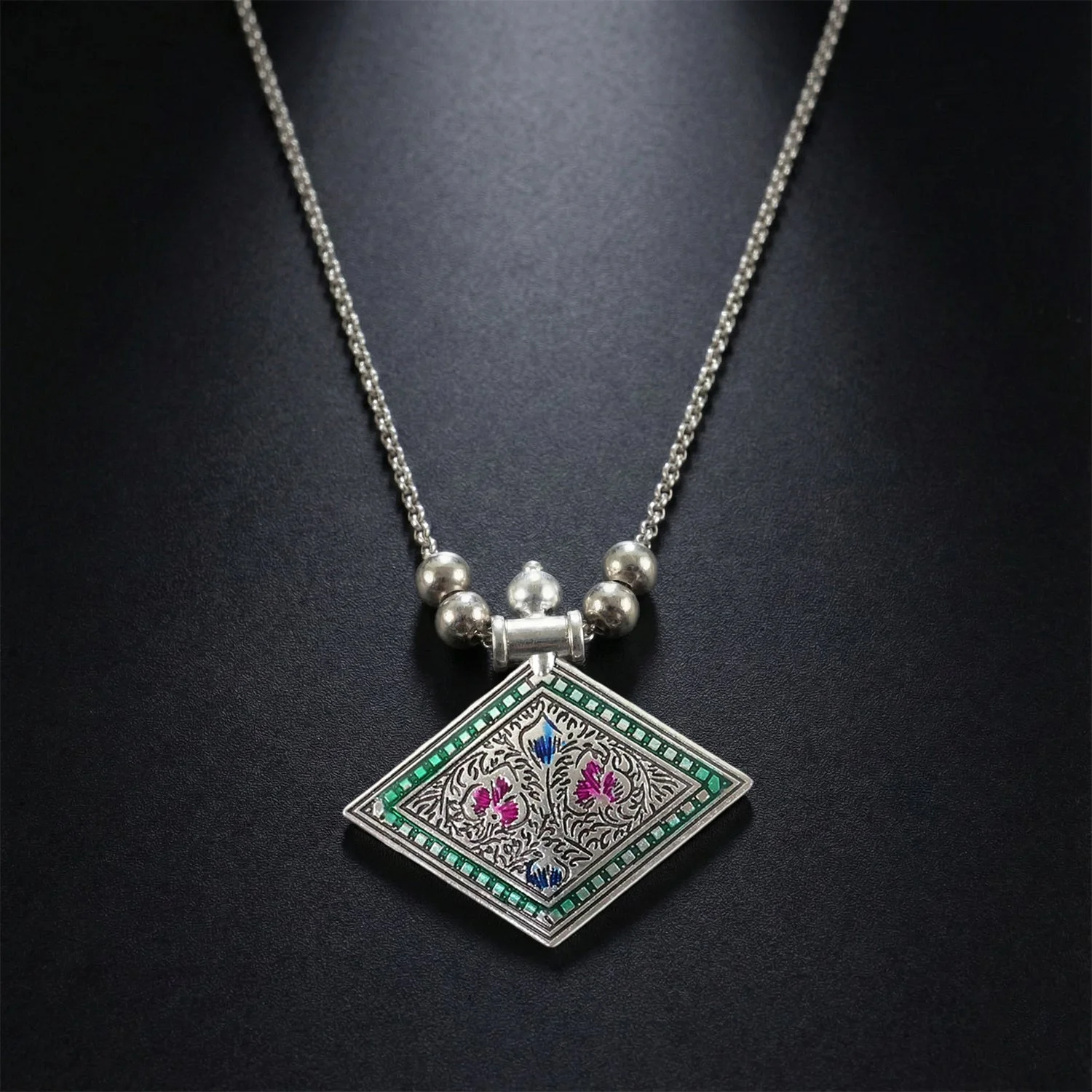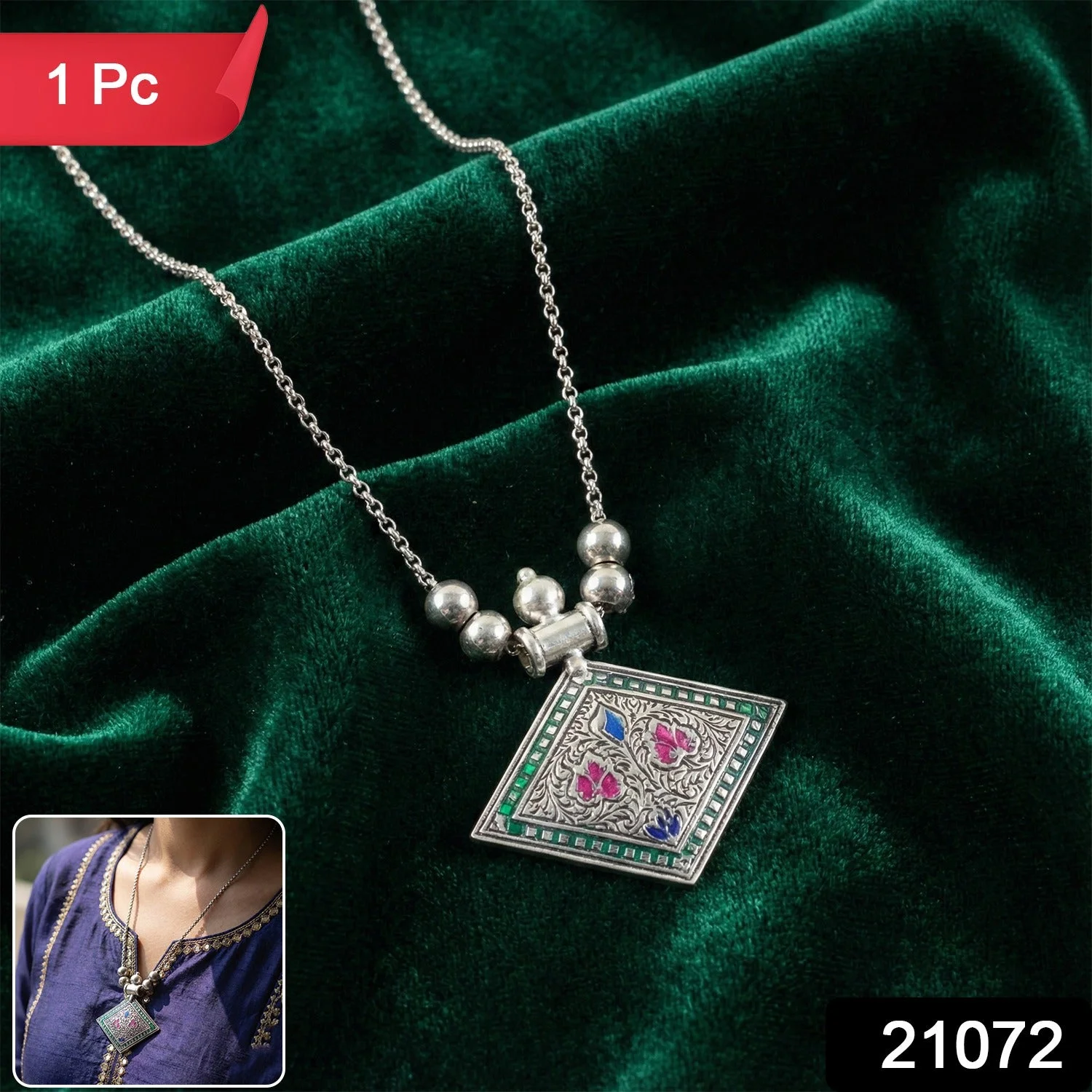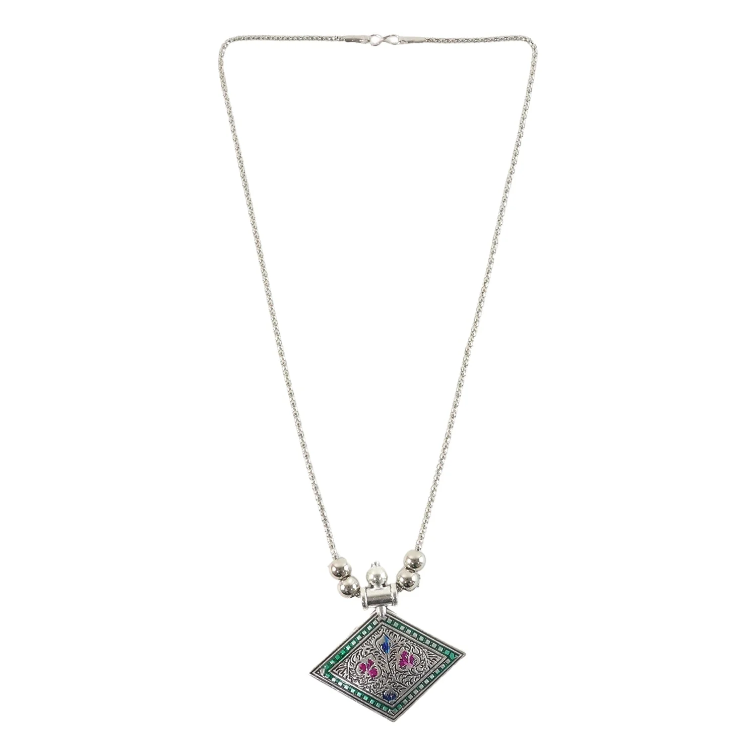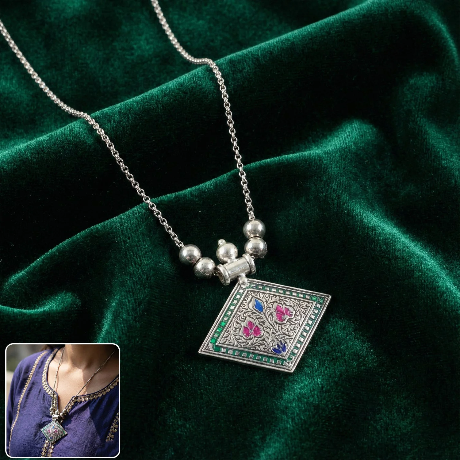 This beautifully designed square pendant necklace features intricate floral-inspired detailing highlighted with subtle colour accents, giving it a rich traditional appeal. Crafted in an oxidised silver finish, the pendant showcases fine engraved patterns bordered with a decorative frame that adds depth and elegance. The necklace is complemented by a sleek metal chain with polished bead accents near the pendant, enhancing its overall charm. Lightweight yet visually striking, this piece blends traditional artistry with everyday wearability. A versatile accessory that pairs effortlessly with ethnic, fusion, and semi-formal outfits.