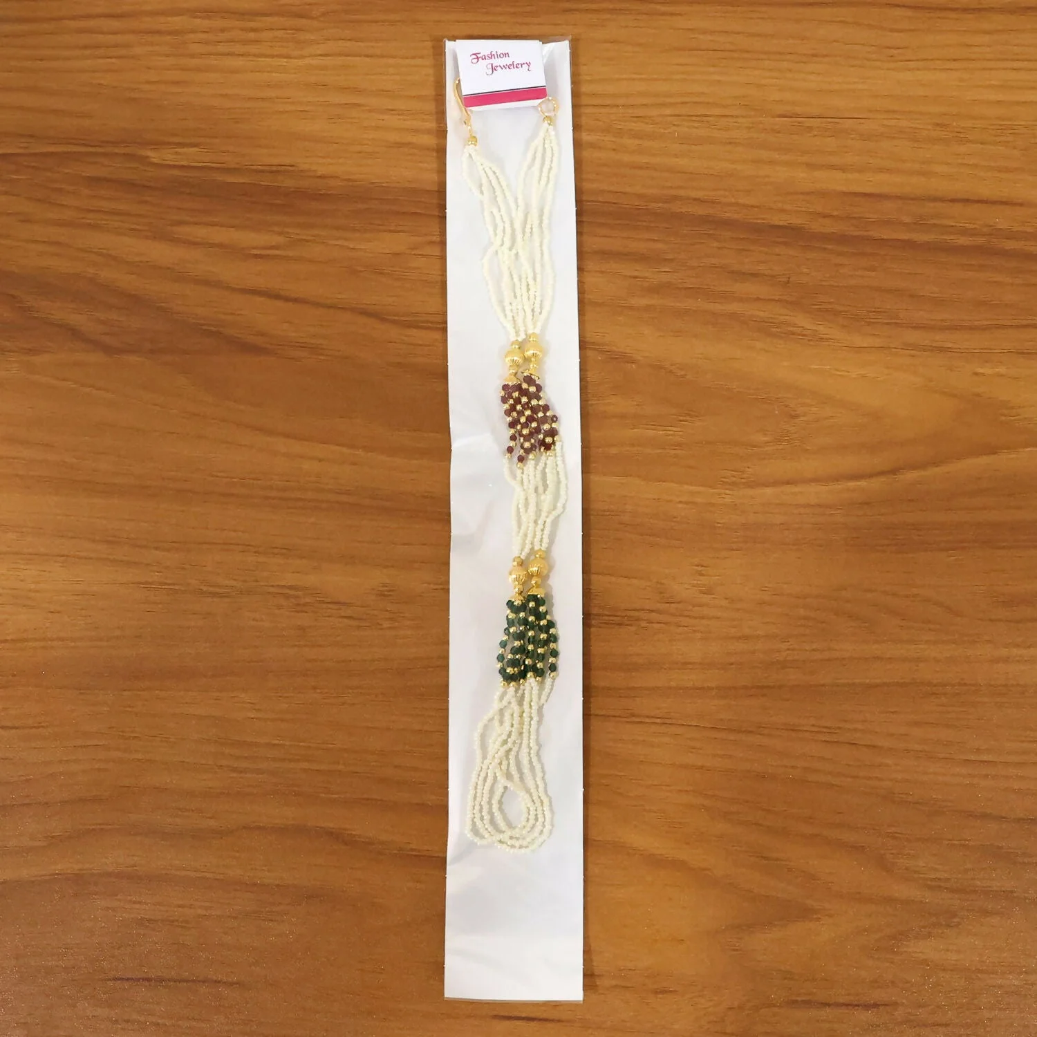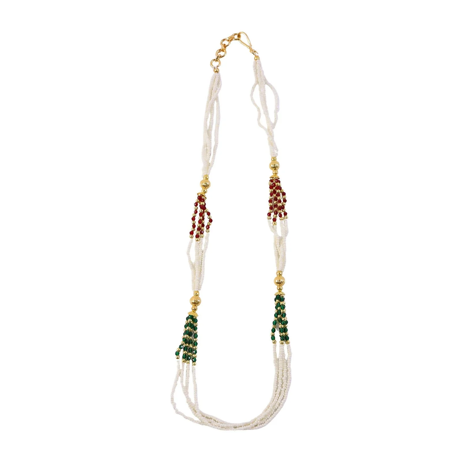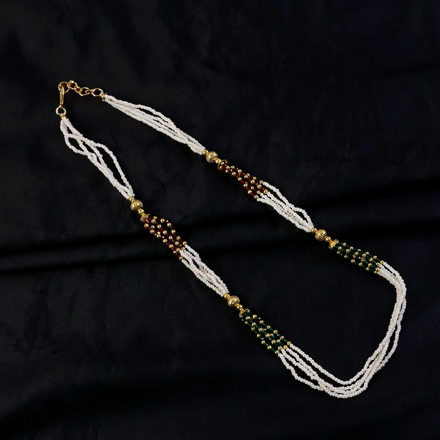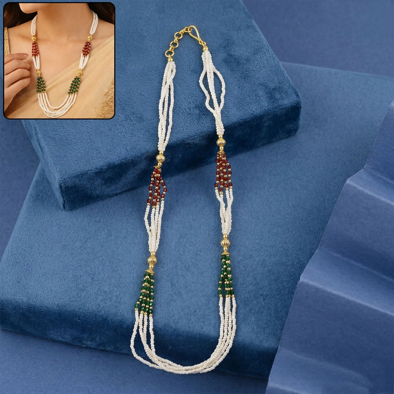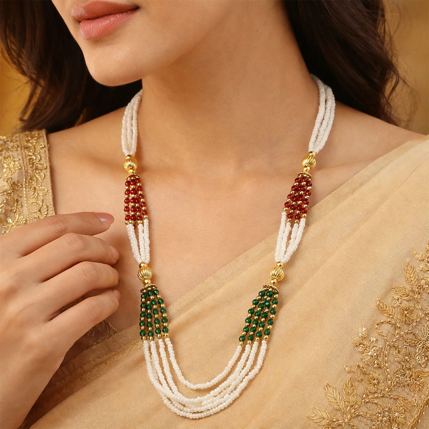 Enhance your ethnic look with this beautifully crafted multi-strand mala necklace featuring classic white beads paired with rich red and green accents. The layered design creates a graceful drape around the neckline, adding elegance and depth to your overall appearance. Designed with intricate detailing and a refined handmade finish, this necklace reflects timeless traditional aesthetics. The combination of vibrant accent beads and soft white strands makes it perfect for festive wear as well as special occasions. A versatile piece that effortlessly complements sarees, lehengas, and ethnic outfits.