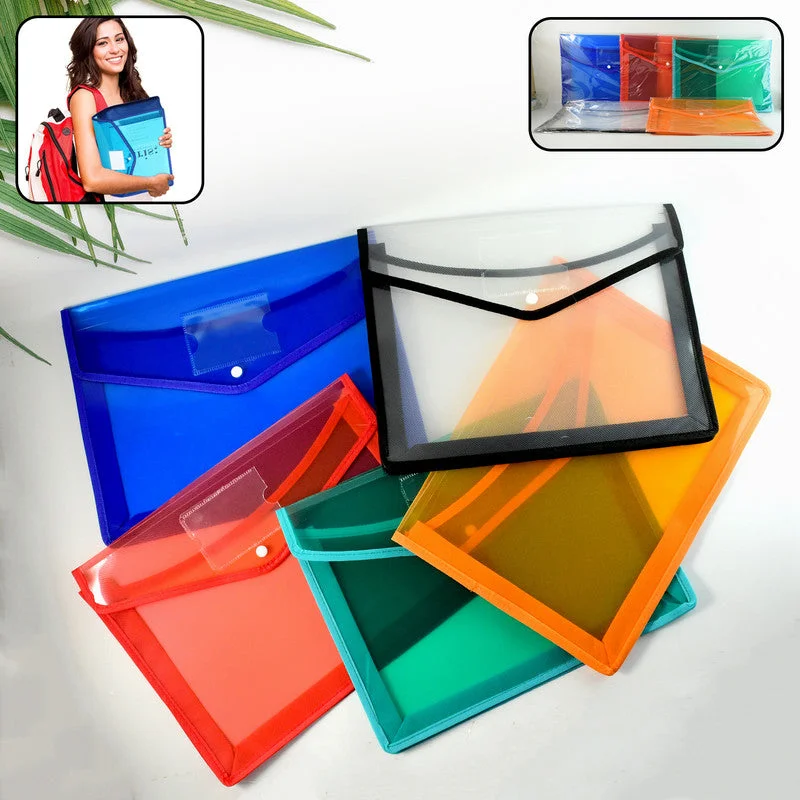 transparent document file folder, multi color document folder, button closure file bag, snap button file folder, clear document file bag, plastic file folder, A4 size document folder, colorful file folder, document storage bag, office file folder, school file folder, stationery document folder, clear plastic file bag