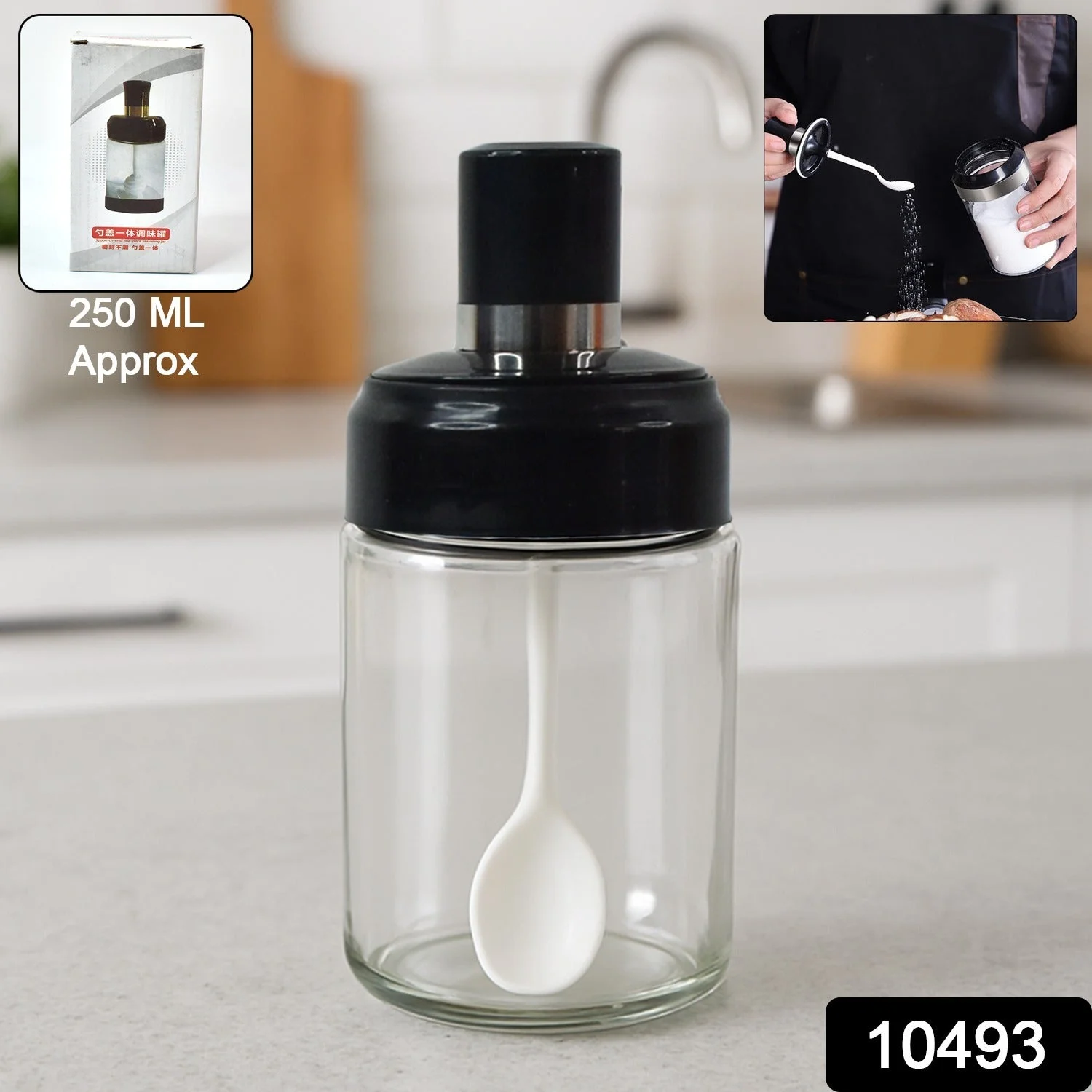 seasoning jar , salt jar , sugar container , spice storage jar , kitchen masala jar , kitchen storage , cooking essentials , condiment storage , glass jar with spoon , measuring spoon jar , airtight spice jar , transparent spice dispenser , black lid storage jar