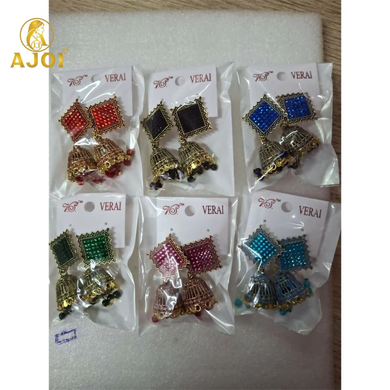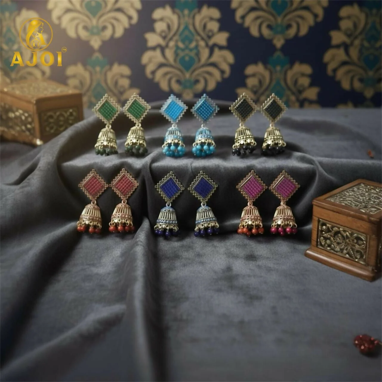Be the first to review Trendy Oxidised Jhumki Earrings with Designer Square Tops (PACK OF 6)!