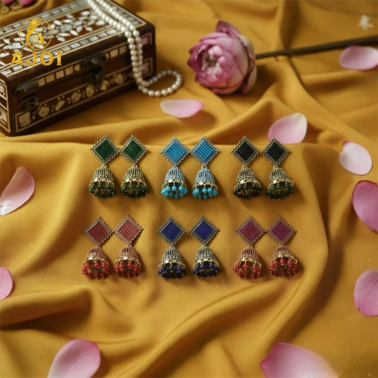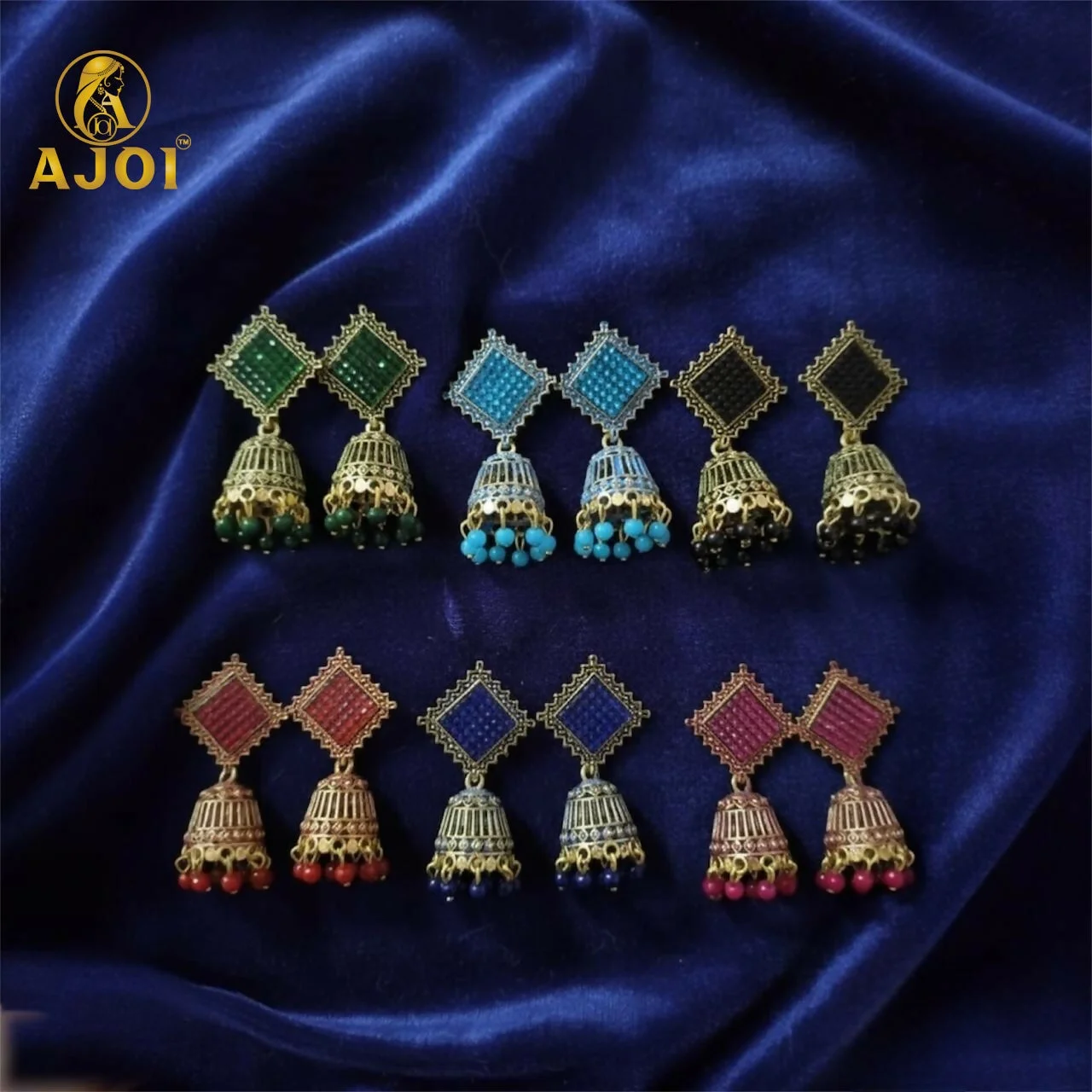 The earrings are available in a variety of rich colors—green, turquoise blue, royal blue, pink, black, red, and more—making them versatile enough to pair with ethnic outfits, festive wear, or Indo-western styles. The intricate metalwork and fine detailing give these jhumkas a handcrafted, premium feel.