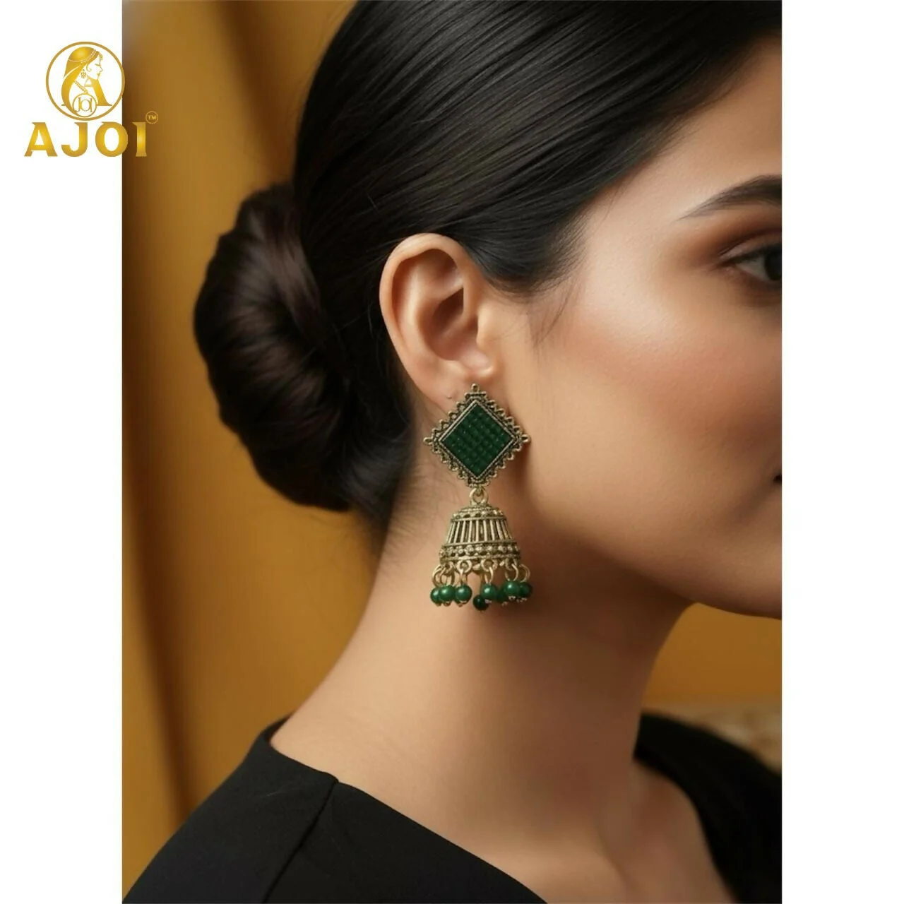 Introducing our stunning collection of Designer Oxidised Jhumka Earrings, crafted to bring a perfect blend of traditional charm and modern elegance to your jewellery wardrobe. Each pair features a beautifully detailed square oxidised stud paired with a classic jhumki dome, adorned with vibrant bead droplets that add grace and movement.