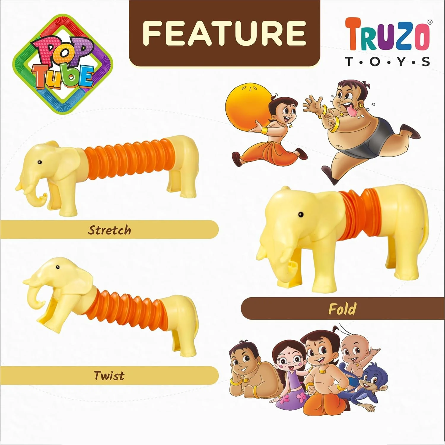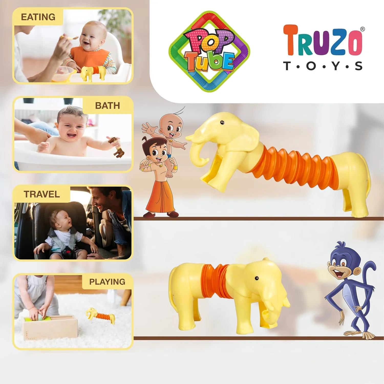 The Truzo Toys Pop Tube Elephant is a fun and engaging toy designed to spark creativity and keep kids entertained with its unique shape-changing design. Featuring a cute elephant look with a telescopic tube body, this toy can be stretched, twisted, bent, and folded into different shapes, providing endless play possibilities. Its lightweight and durable build makes it easy for little hands to handle, while also serving as a stress-relief and sensory play toy. Perfect for playtime at home, travel, bath, or even as a distraction during meals, this Pop Tube Elephant helps improve focus, imagination, and motor skills while keeping kids happily engaged.