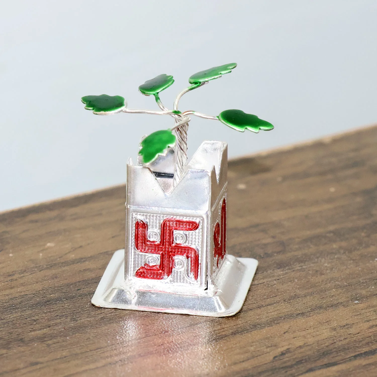 Bring a touch of devotion and serenity to any corner with this Tulsi plant miniature idol mounted on a temple-style kalash base. The handcrafted look, sacred Swastik and “Shri” motifs, and glossy finish make it an auspicious addition to pooja ghars, work desks, reception counters, cars, and gift hampers. Compact yet eye-catching, it elevates the spiritual vibe without needing maintenance like a real plant—simply place it on a clean surface, and it becomes a daily reminder of positivity, prosperity, and protection.