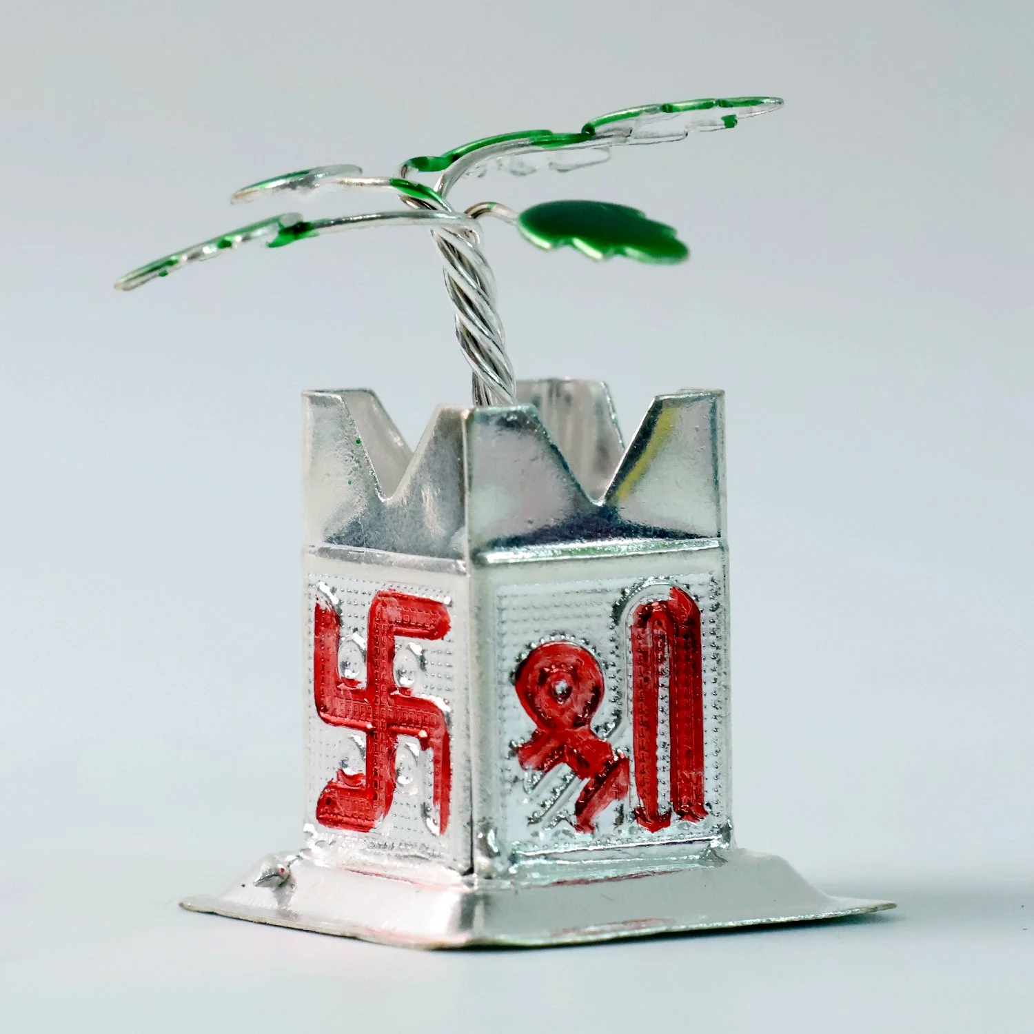 Design Elements: Tulsi sprig, temple-style kalash base, Swastik & “Shri” motifs