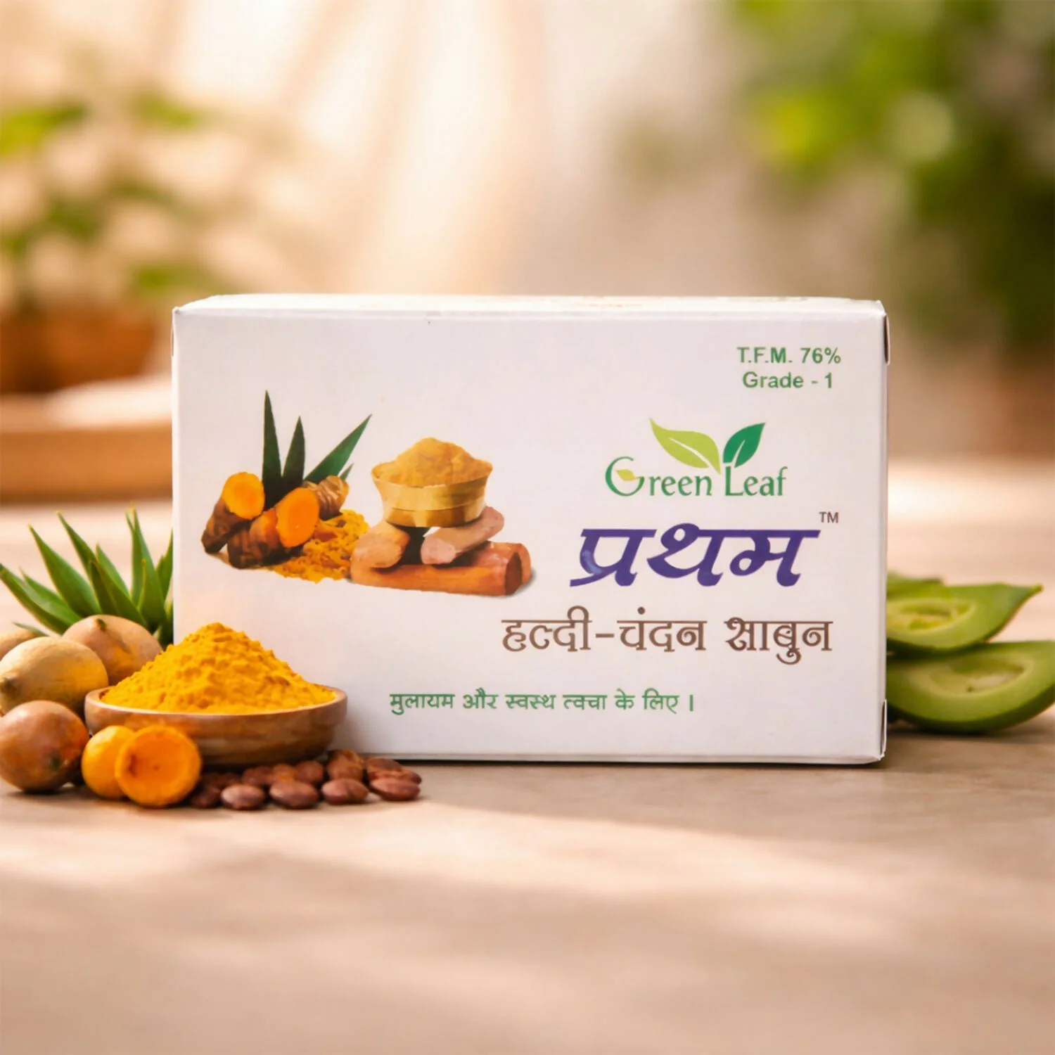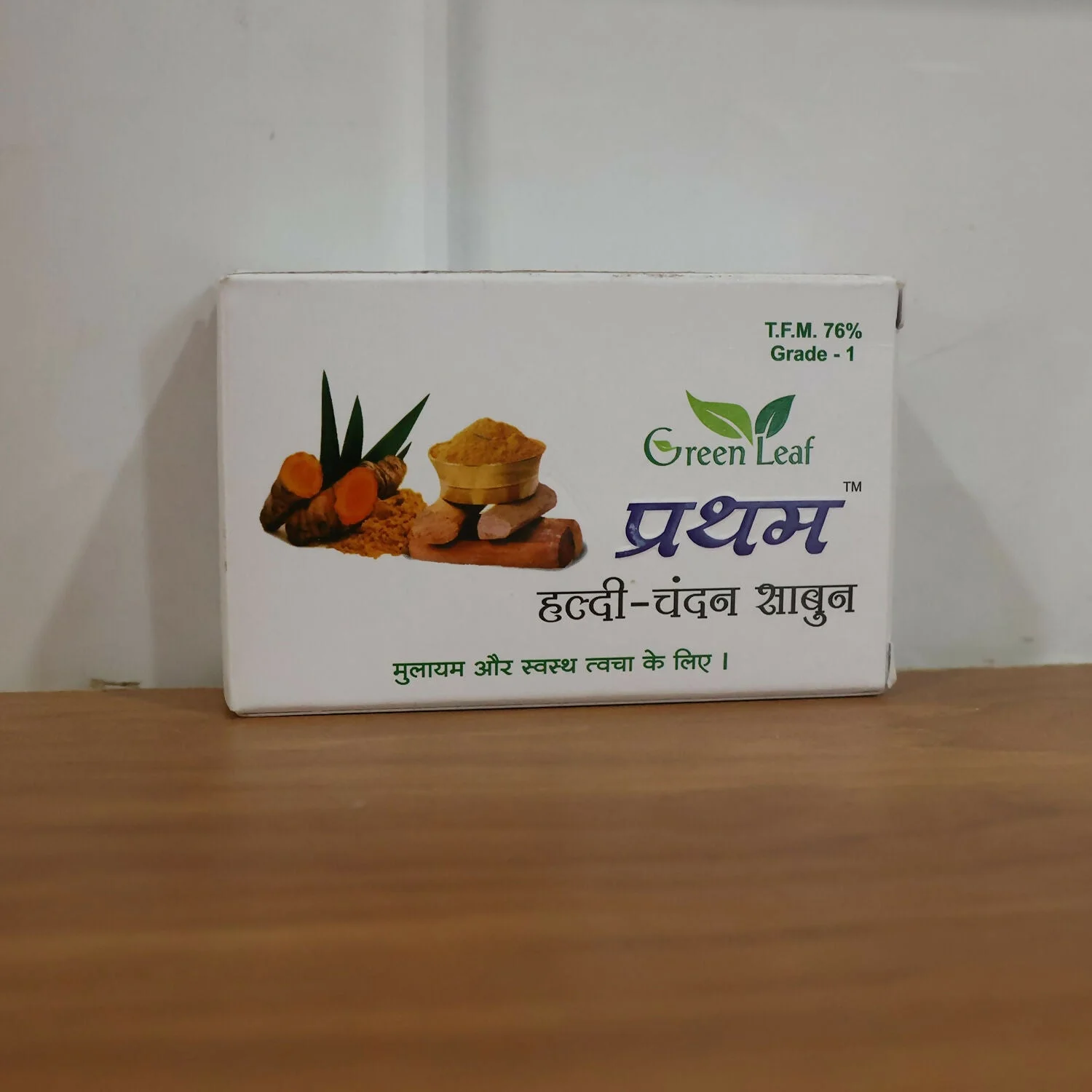 Green Leaf Prathem Turmeric Chandan Soap 75gm is enriched with the traditional goodness of Haldi (Turmeric) and Chandan (Sandalwood) to support healthy and refreshed skin. Formulated with high TFM Grade-1 quality, it helps cleanse effectively while maintaining natural moisture balance. Turmeric is known for its skin-purifying properties, while sandalwood helps soothe and enhance skin glow. The rich lather removes dirt and excess oil without leaving the skin dry. Suitable for daily bathing, it keeps your skin soft, smooth, and revitalized.