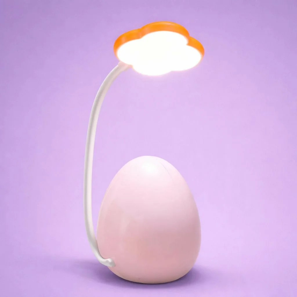 Bring a magical touch to your child’s room with this adorable unicorn egg desk lamp. Designed with a cute unicorn sitting inside a cracked egg shell, this lamp combines a soft night light with a flexible study lamp for reading, drawing, and homework. The cloud-shaped LED lamp head provides gentle lighting, while the warm glow inside the egg creates a calming bedtime atmosphere. With its rechargeable battery and lightweight design, this lamp is perfect for study tables, bedside tables, nurseries, and kids’ bedrooms.