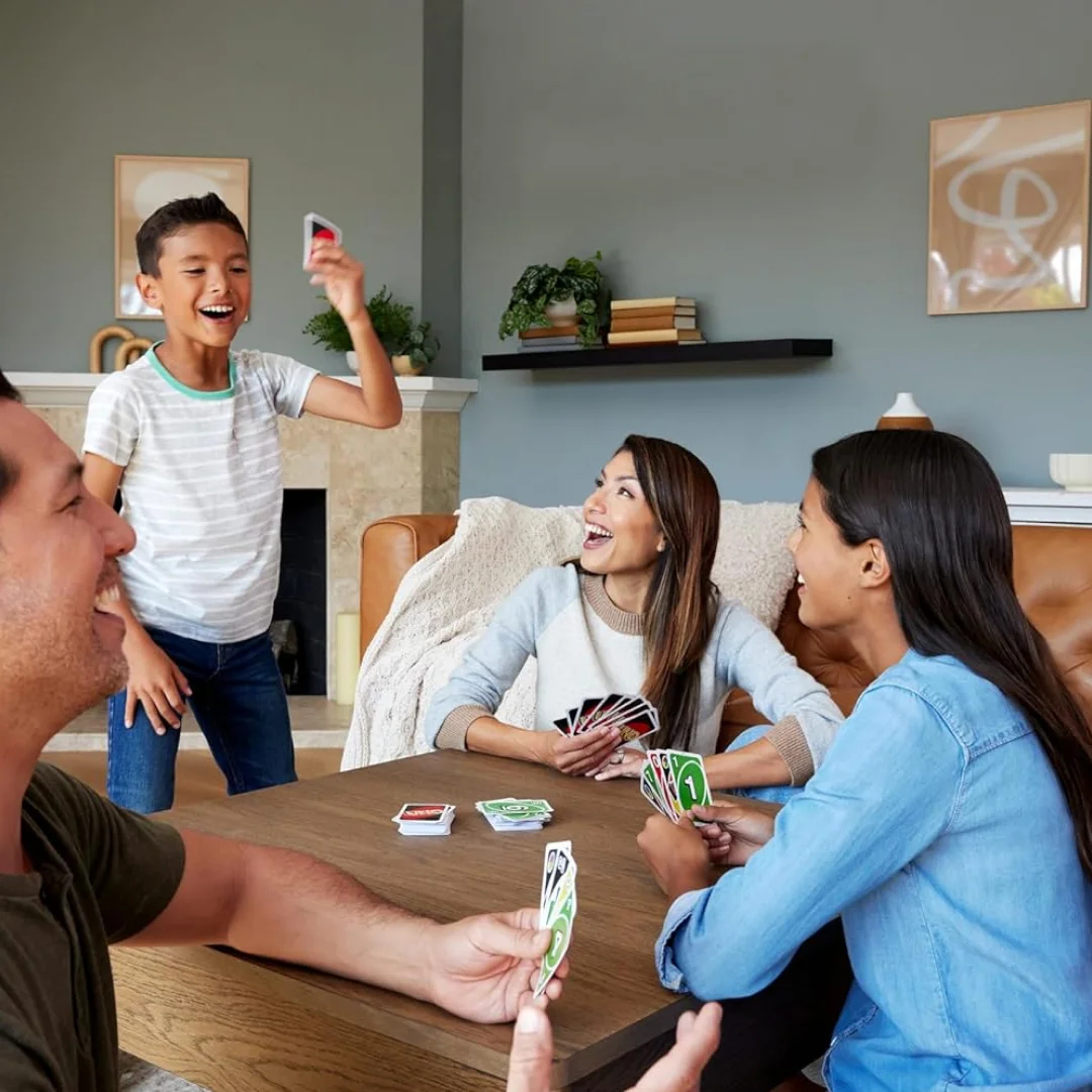 UNO is the classic and beloved card game that’s easy to pick up and impossible to put down! Players take turns matching a card in their hand with the current card shown on top of the deck either by color or number. Special action cards deliver game-changing moments as they each perform a function to help you defeat your opponents. These include Skips, reverses, draw twos, color-changing wild and draw four wild cards. You’ll find 25 of each color (red, green, blue, and yellow), plus the eight wild cards, inside the 108-card deck. If you can’t make a match, you must draw from the central pile! And when you’re down to one card, don’t forget to shout UNO The first player to rid themselves of all the cards in their hand before their opponents wins. It’s fast fun for everyone! Includes 108 cards and instructions. Colors and decorations may vary.
