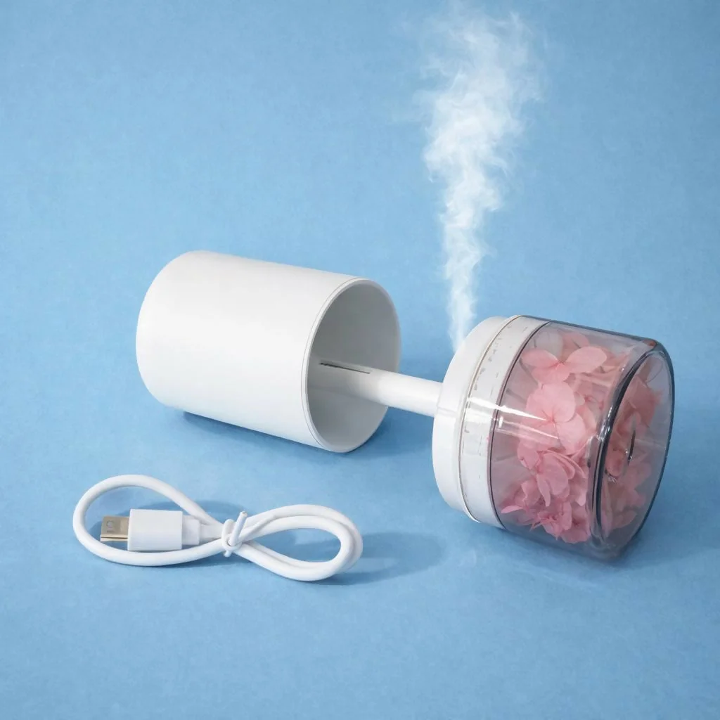 Create a refreshing and relaxing atmosphere with this portable USB humidifier diffuser. Designed with a stylish transparent top filled with decorative flowers, it adds a beautiful aesthetic touch to your desk, bedroom, or workspace while helping maintain comfortable humidity levels. The compact and lightweight design makes it perfect for home, office desks, study tables, or bedside use. Powered by a USB cable, it is convenient to operate with laptops, power banks, or adapters. The simple cotton swab system ensures easy maintenance and smooth mist output for a soothing environment.
