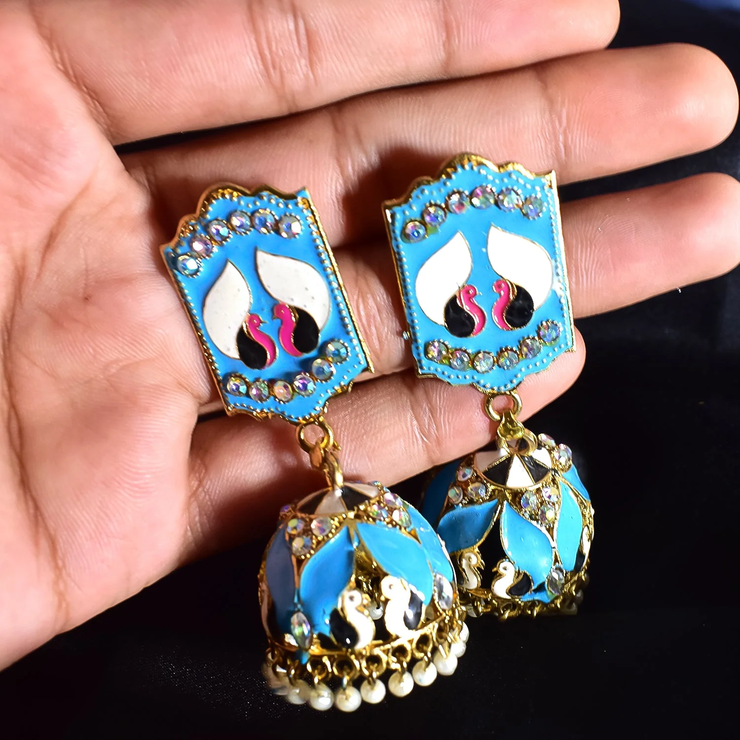- Featuring a bold blue hue paired with intricate detailing, these earrings offer a modern twist on the classic jumka style.
