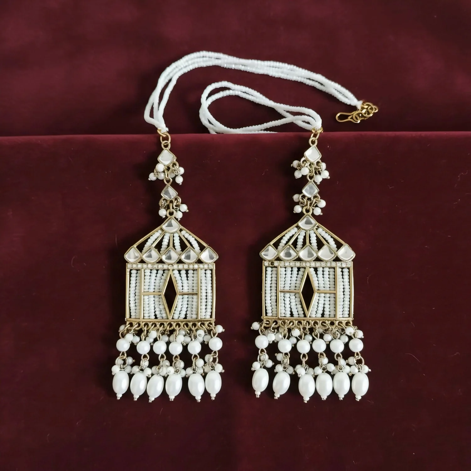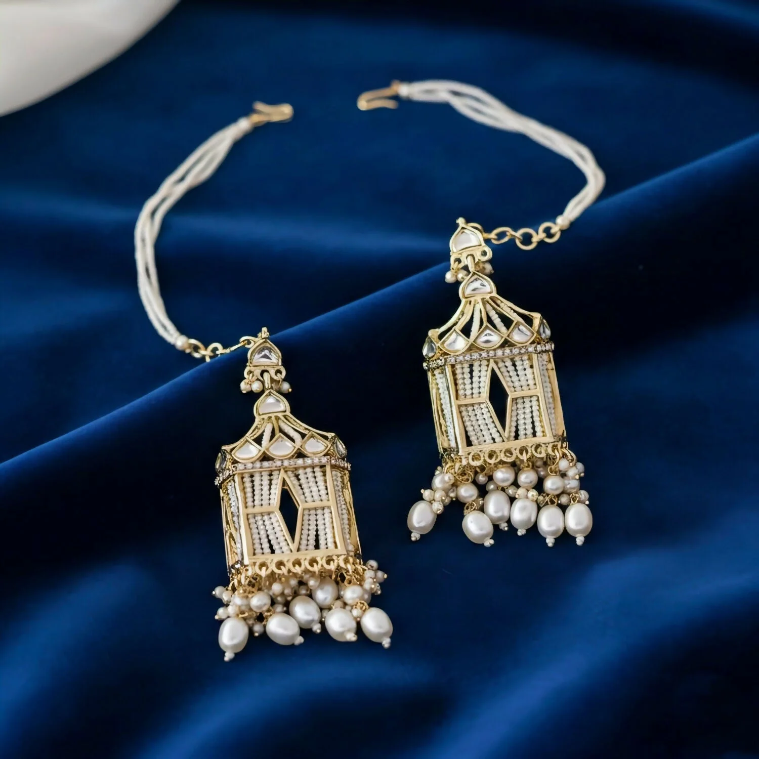 Attachment: Features a multi-strand seed pearl ear chain (Sahare) with a hook, designed to drape gracefully over the ear for added support and a grander appearance.