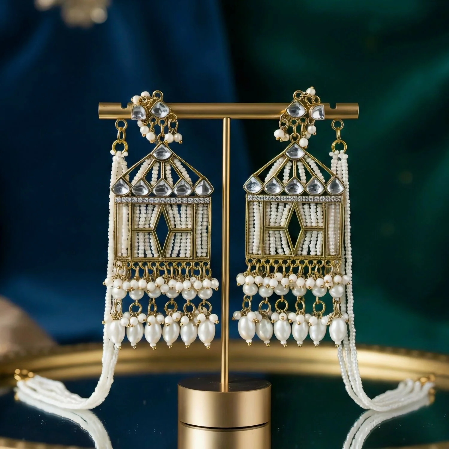 Capture the essence of heritage with these uniquely designed Birdcage-inspired statement earrings. These pieces are a celebration of vintage aesthetics, blending architectural geometry with the classic elegance of Kundan and pearl work.
