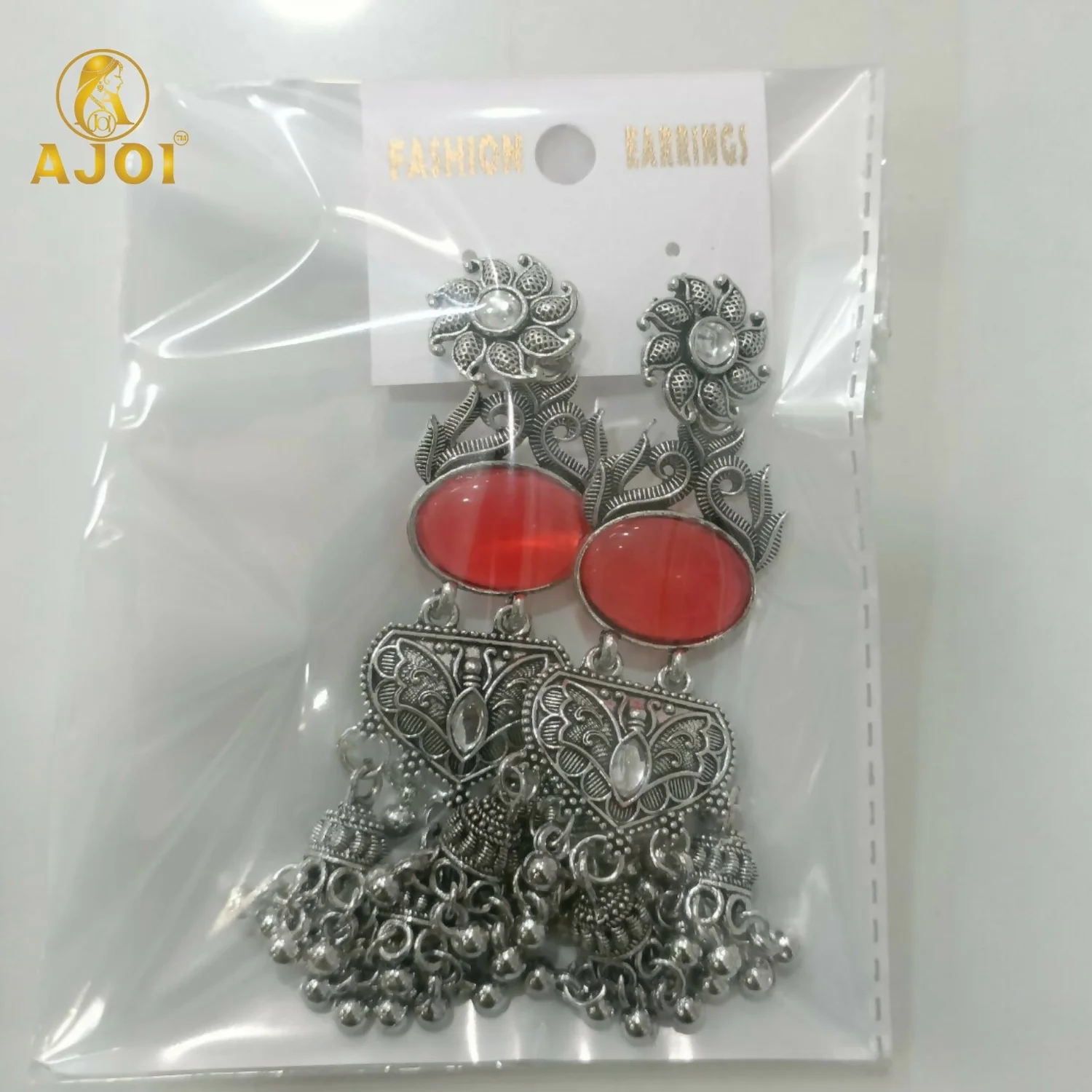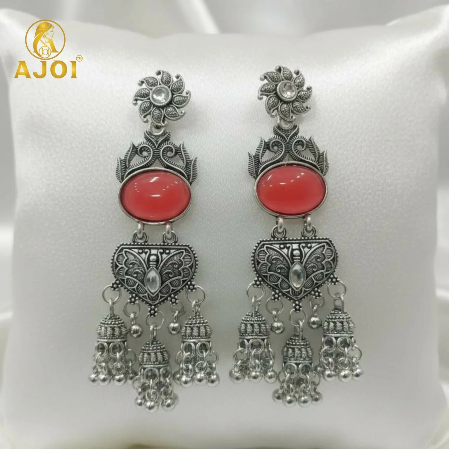 Elevate your ethnic jewelry collection with the timeless beauty of Handcrafted Oxidized Silver Red Stone Jhumka Earrings, thoughtfully designed to reflect traditional artistry with a touch of elegance. These stunning earrings begin with a finely detailed floral stud, leading to a rich red oval stone centerpiece that adds warmth and vibrant charm to the design.