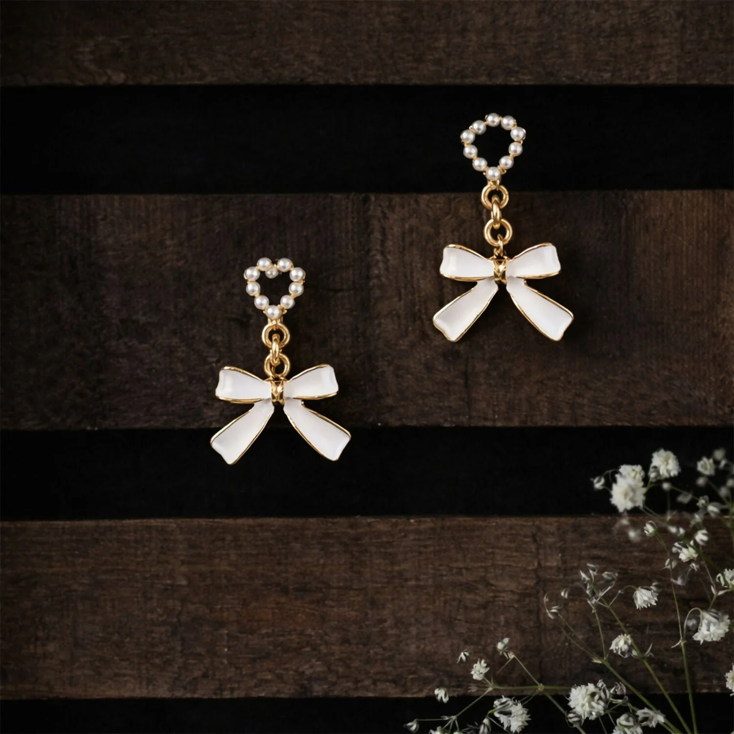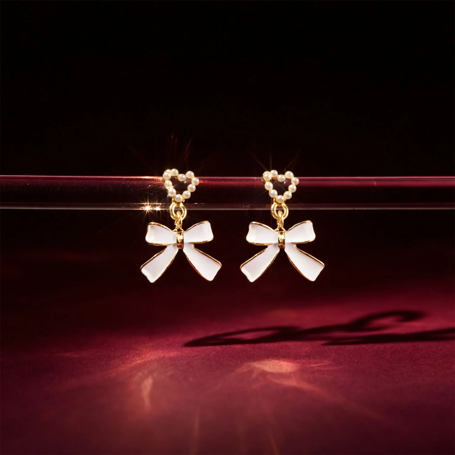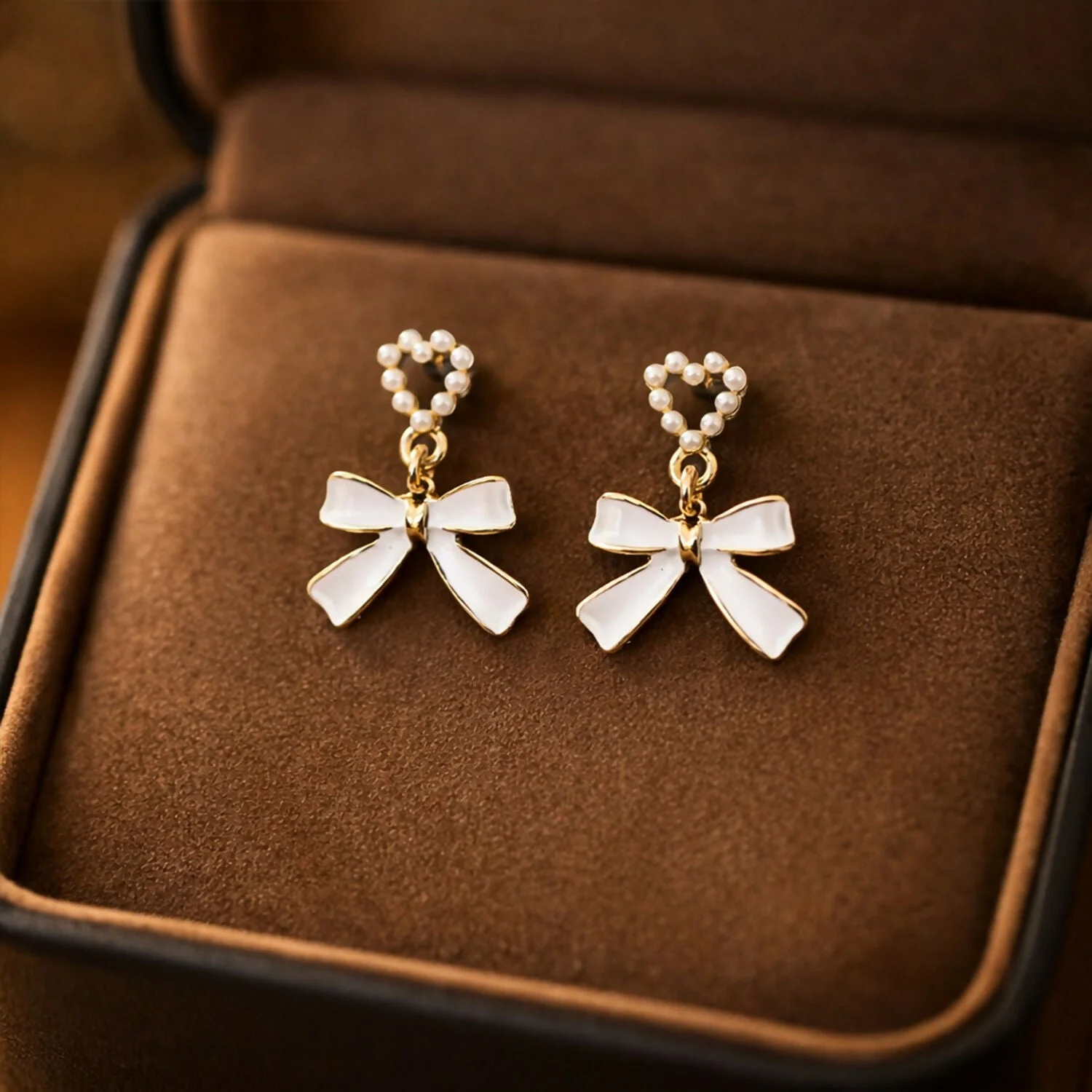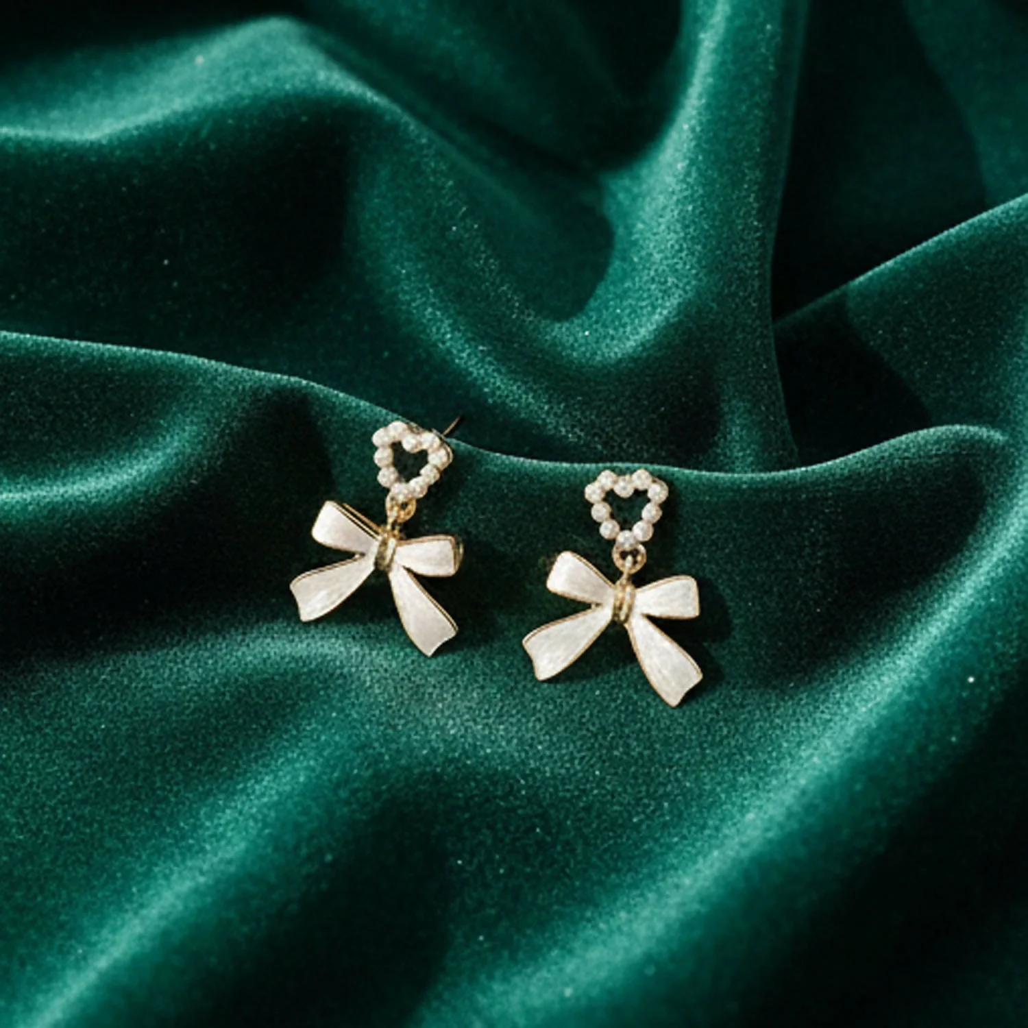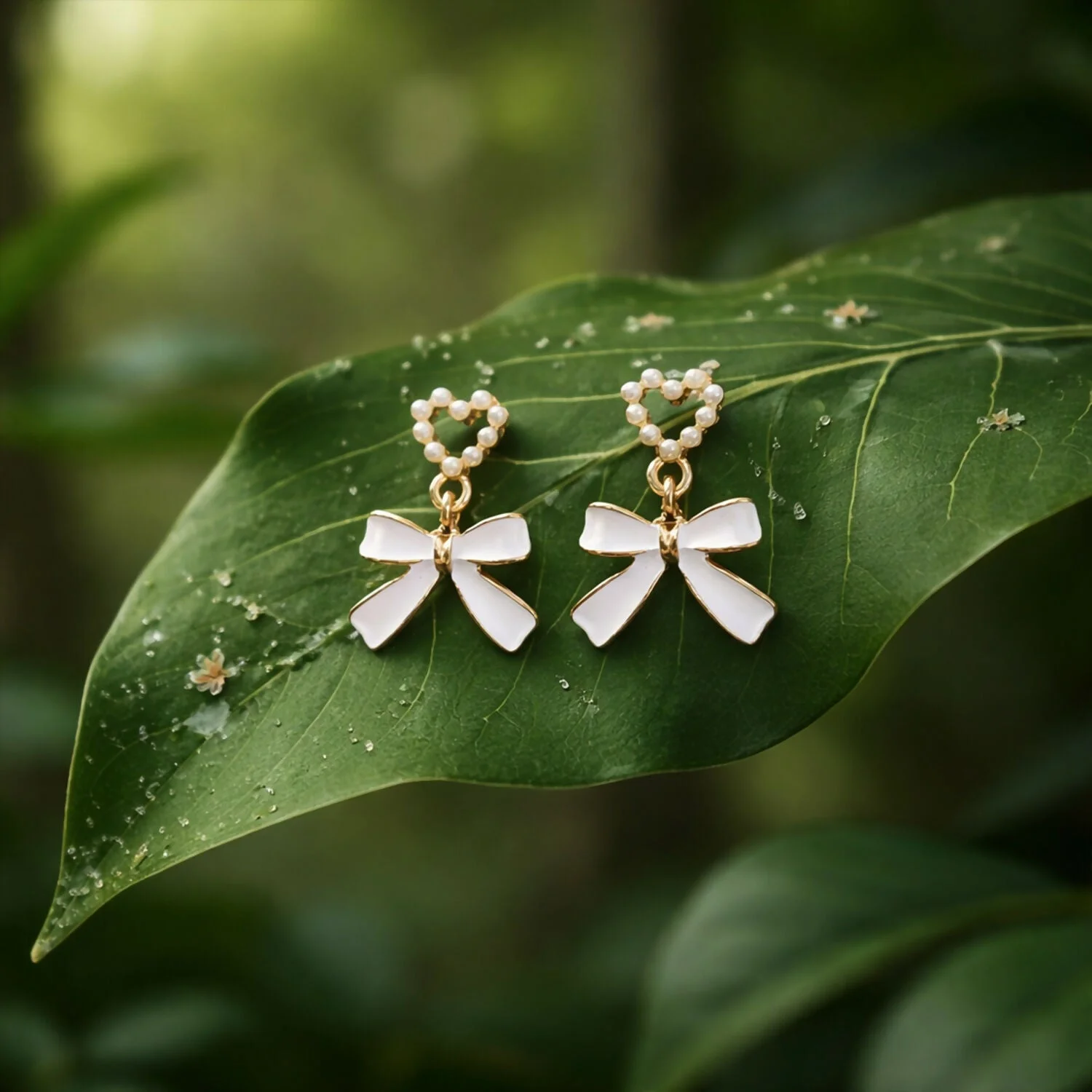 Be the first to review Vintage-Inspired Pearl Heart & Bow Drop Earrings – Elegant Gold-Trimmed Statement Jewelry!