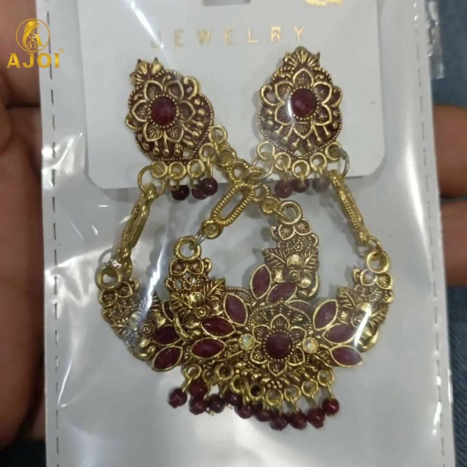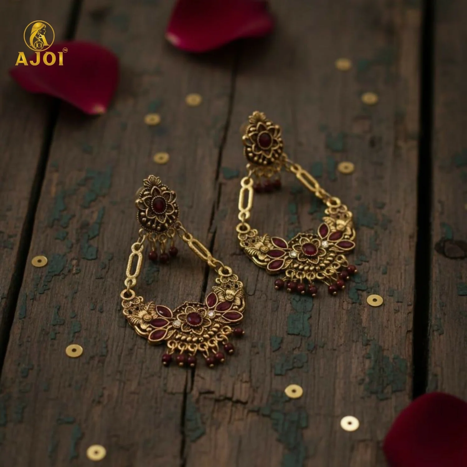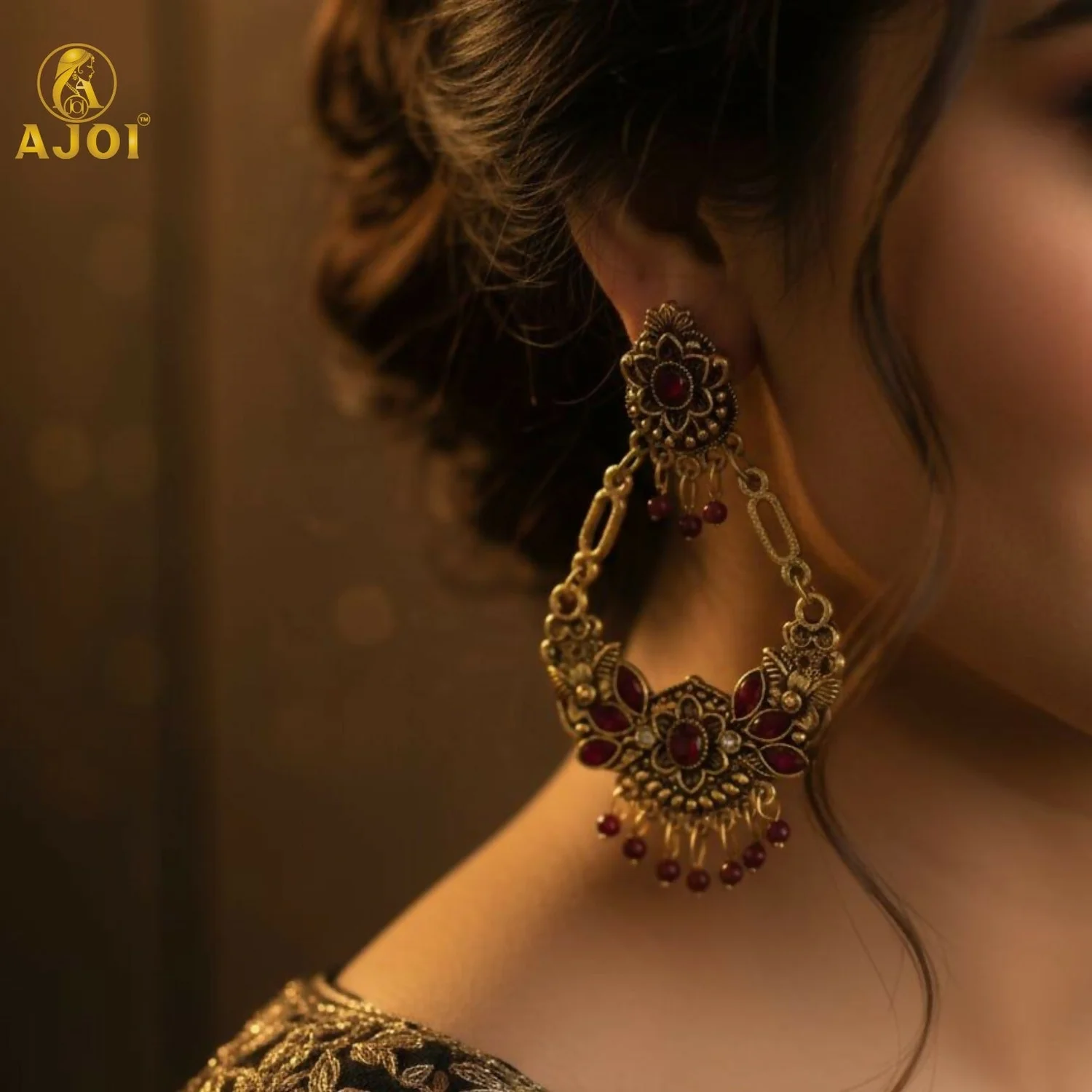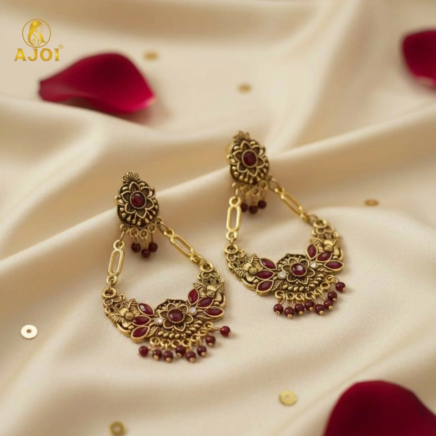 Enhance your ethnic look with these stunning Vintage Maroon Floral Chandbali Earrings, designed with traditional artistry and antique royal charm. The chandelier-style silhouette features intricate floral motifs highlighted with rich maroon enamel accents, giving the earrings a regal and elegant appeal.