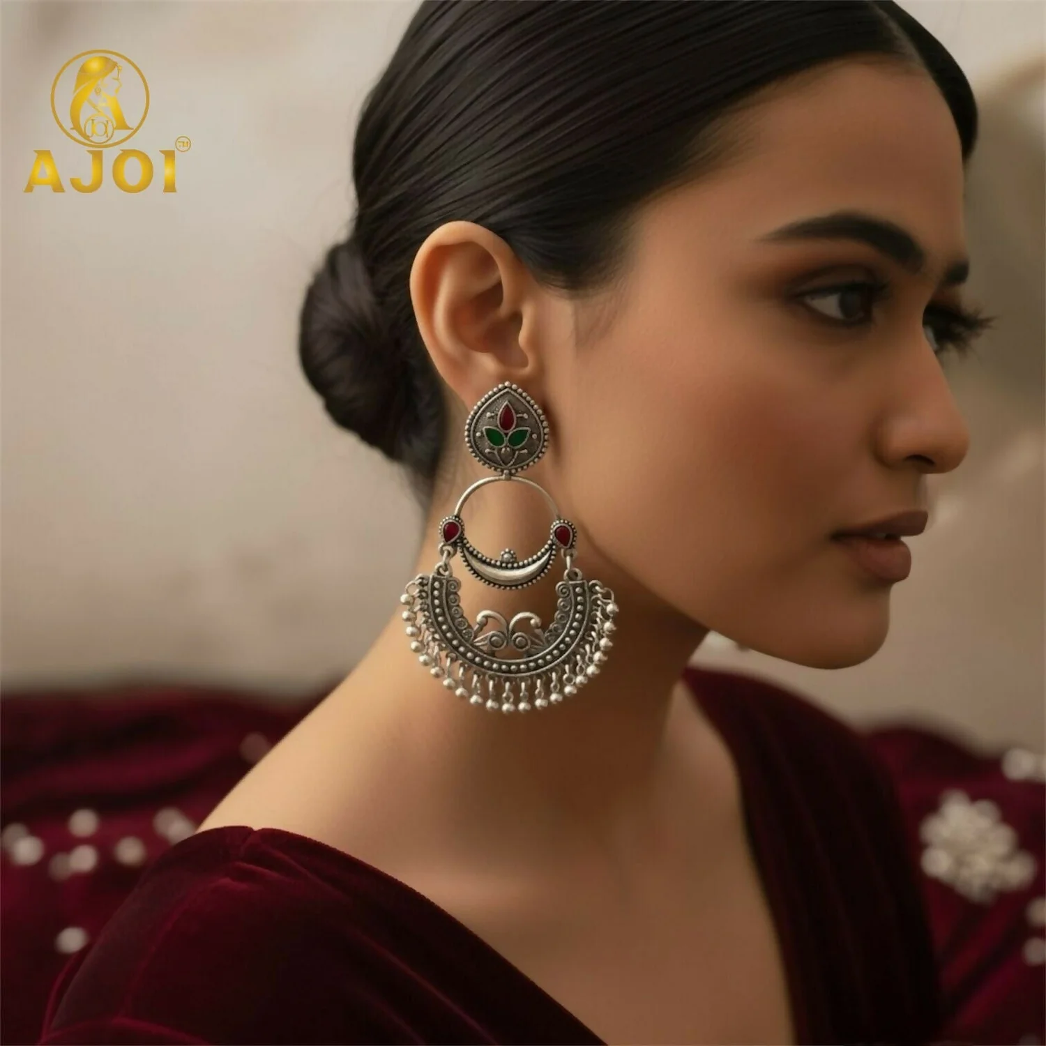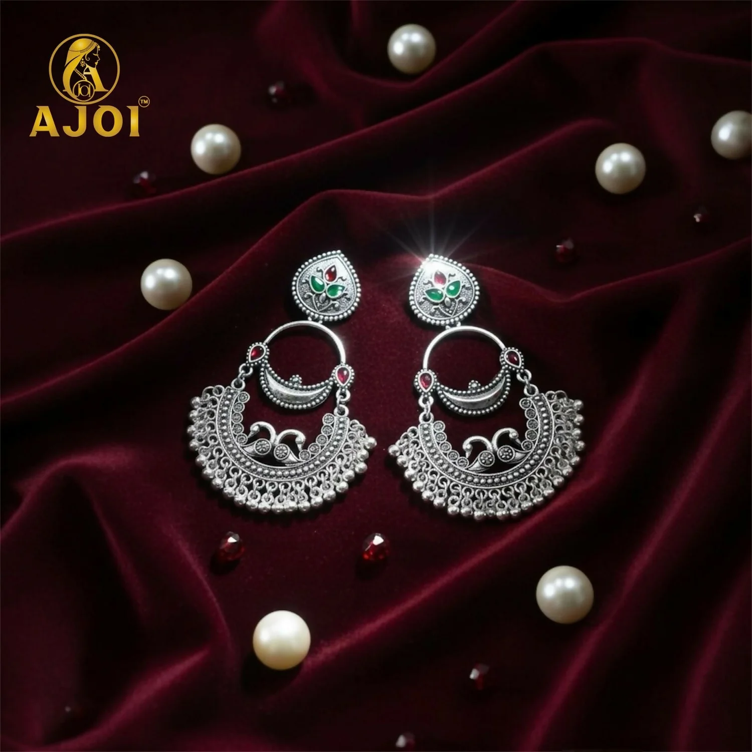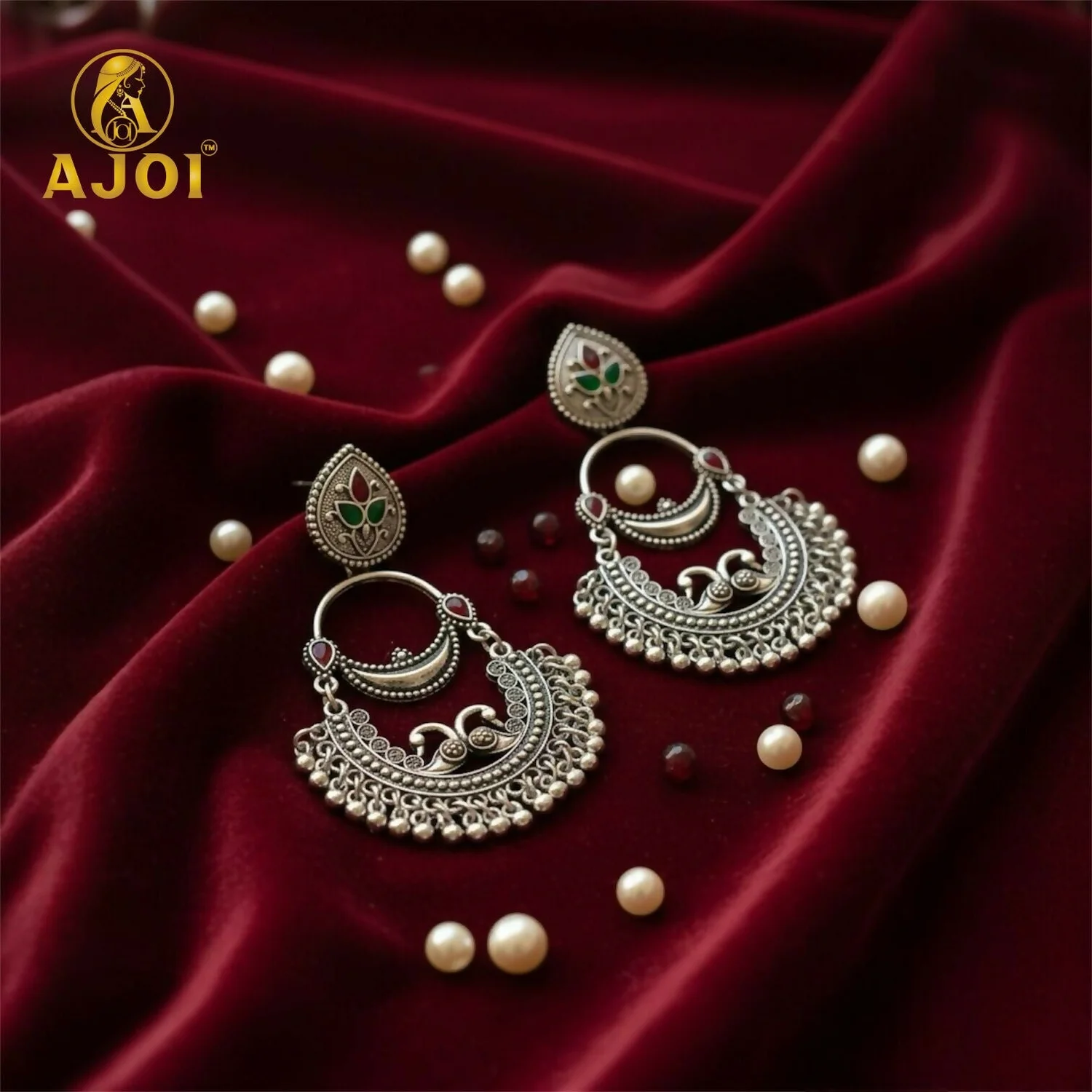 Exuding timeless elegance and traditional craftsmanship, these Oxidised Silver Chandbali Earrings are a perfect blend of vintage artistry and regal charm. The earrings feature an intricately carved crescent design, enhanced with delicate beadwork that adds depth, movement, and grace to every glance.