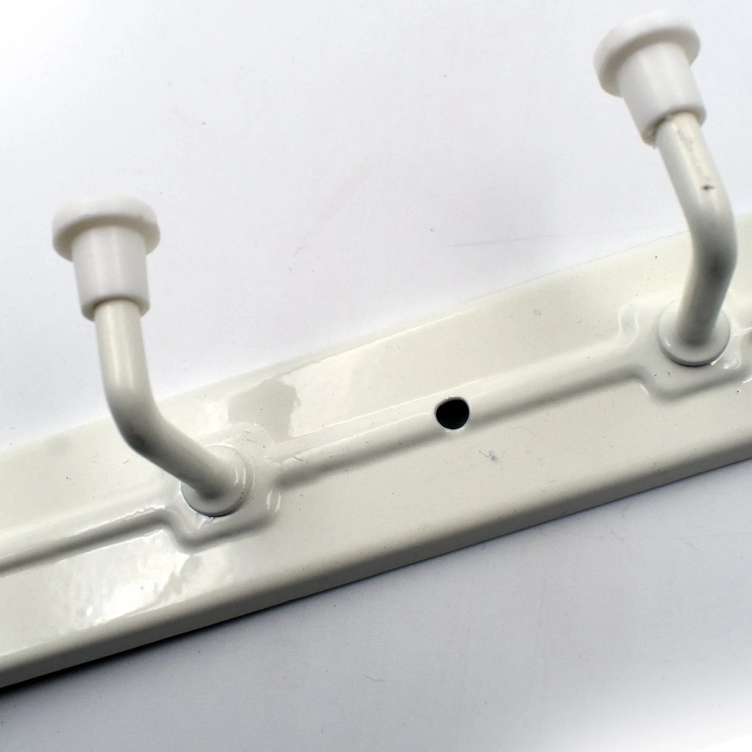 The sturdy wall-mounted coat rack provides a horizontal row of four hooks for durable, reliable storage space. Each hook measures 2-1/4 inches deep and can hold up to 4 pounds (1.81 kg) for a maximum weight limit of up to 20 pounds (ca. 9 kg) total for the rack.