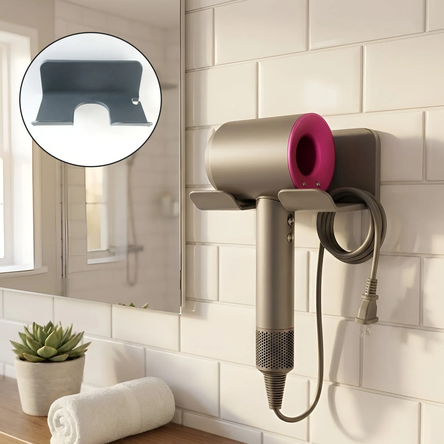This wall-mounted hair dryer holder is a smart and space-saving solution designed to keep your styling tools neatly organized and easily accessible. Crafted for everyday convenience, it securely holds a hair dryer while preventing clutter on countertops and dressing tables. The adhesive base allows easy installation without drilling, making it ideal for modern bathrooms and personal grooming spaces. Its open design supports proper airflow and quick placement after use. Suitable for daily home use, this holder helps maintain a clean, organized, and efficient grooming area.