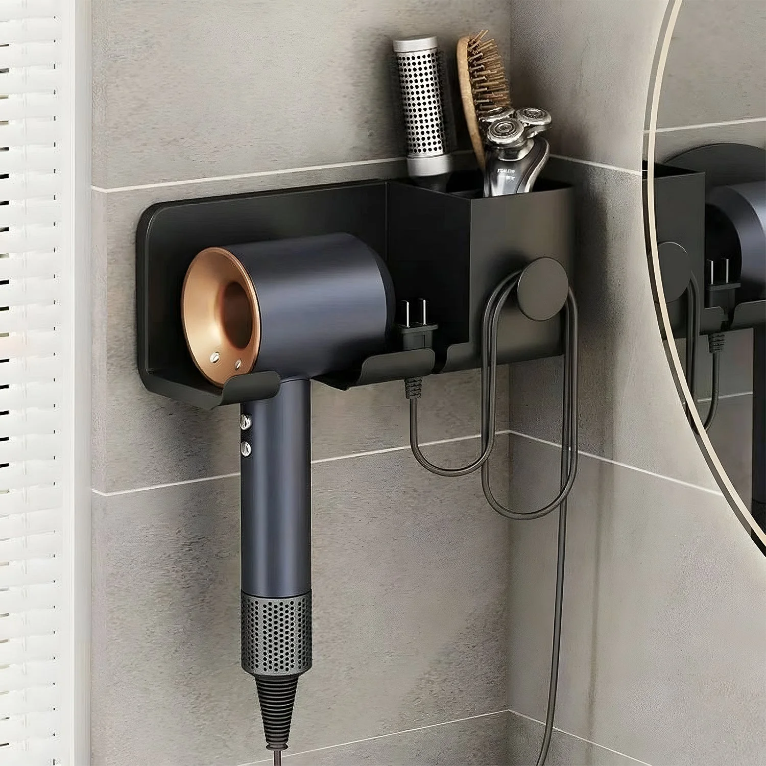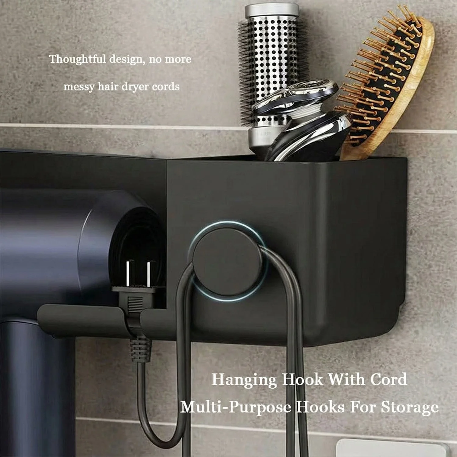 wall mounted hair dryer holder, hair dryer storage rack, bathroom hair dryer organizer, wall mount dryer shelf, multipurpose bathroom organizer, hair styling tool holder, bathroom storage hook, hair dryer hanging rack, dressing area organizer, wall mount bathroom shelf, hair dryer and accessory holder, space saving bathroom rack