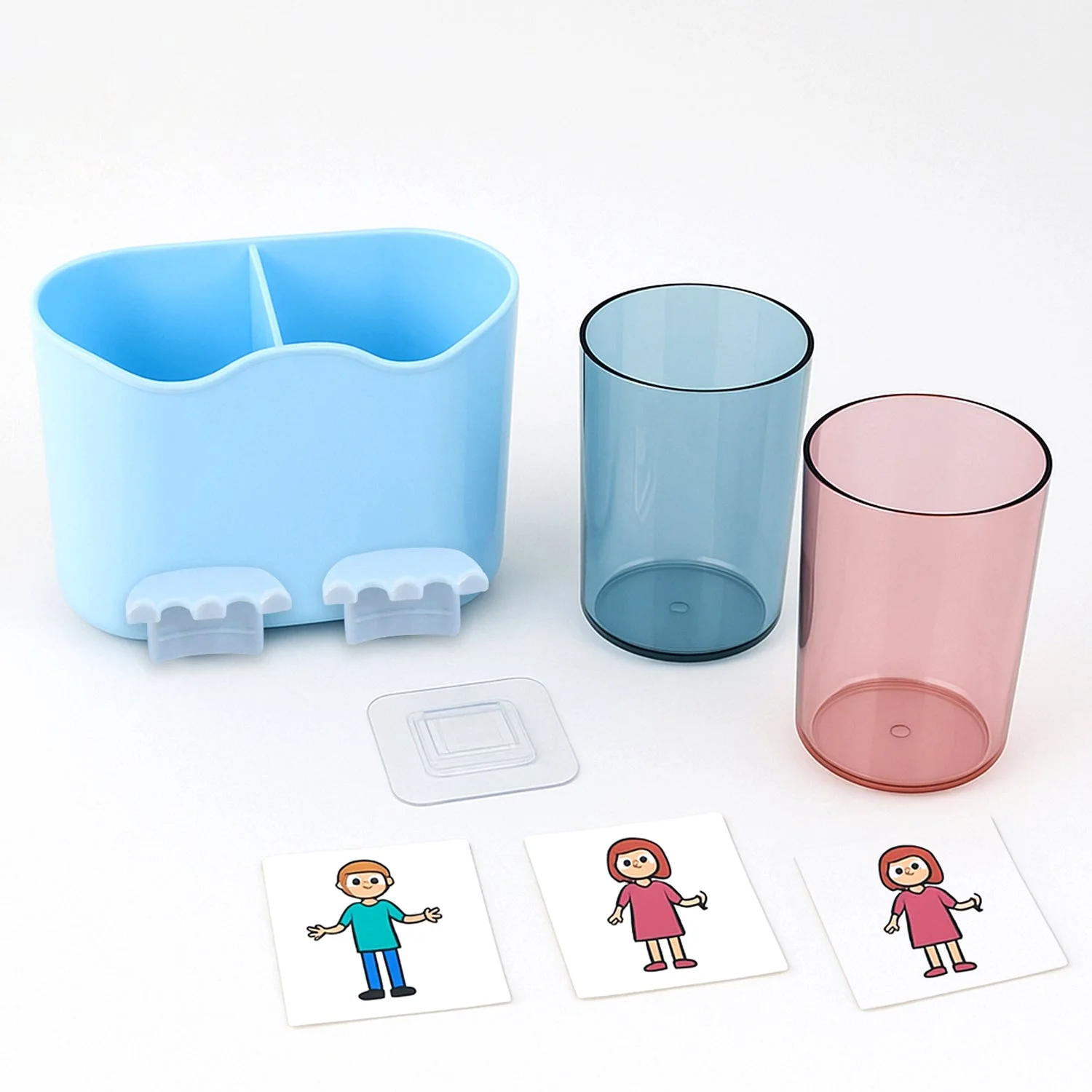 Included: 1 holder, 2 cups, 1 adhesive sticker, cartoon labels